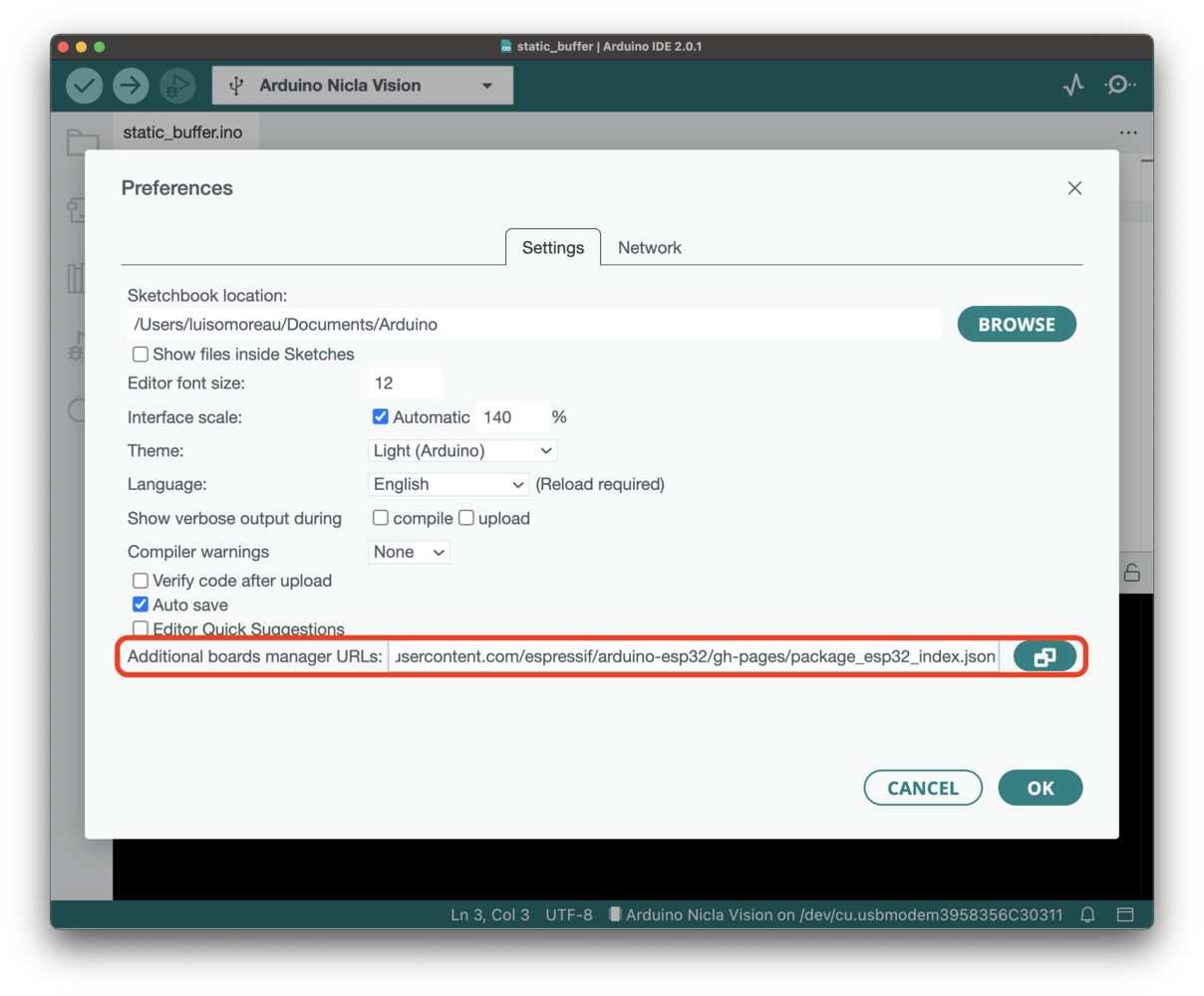 For the ESP32 boards, we officially support the ESP-EYE. Other boards have been tested such as the ESP32-CAM AI Thinker. To install ESP32 boards, go to Arduino->Preferences and add the following link to the additional boards manager URLs: