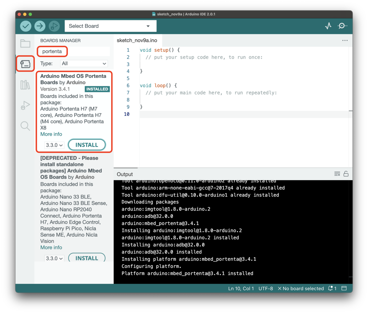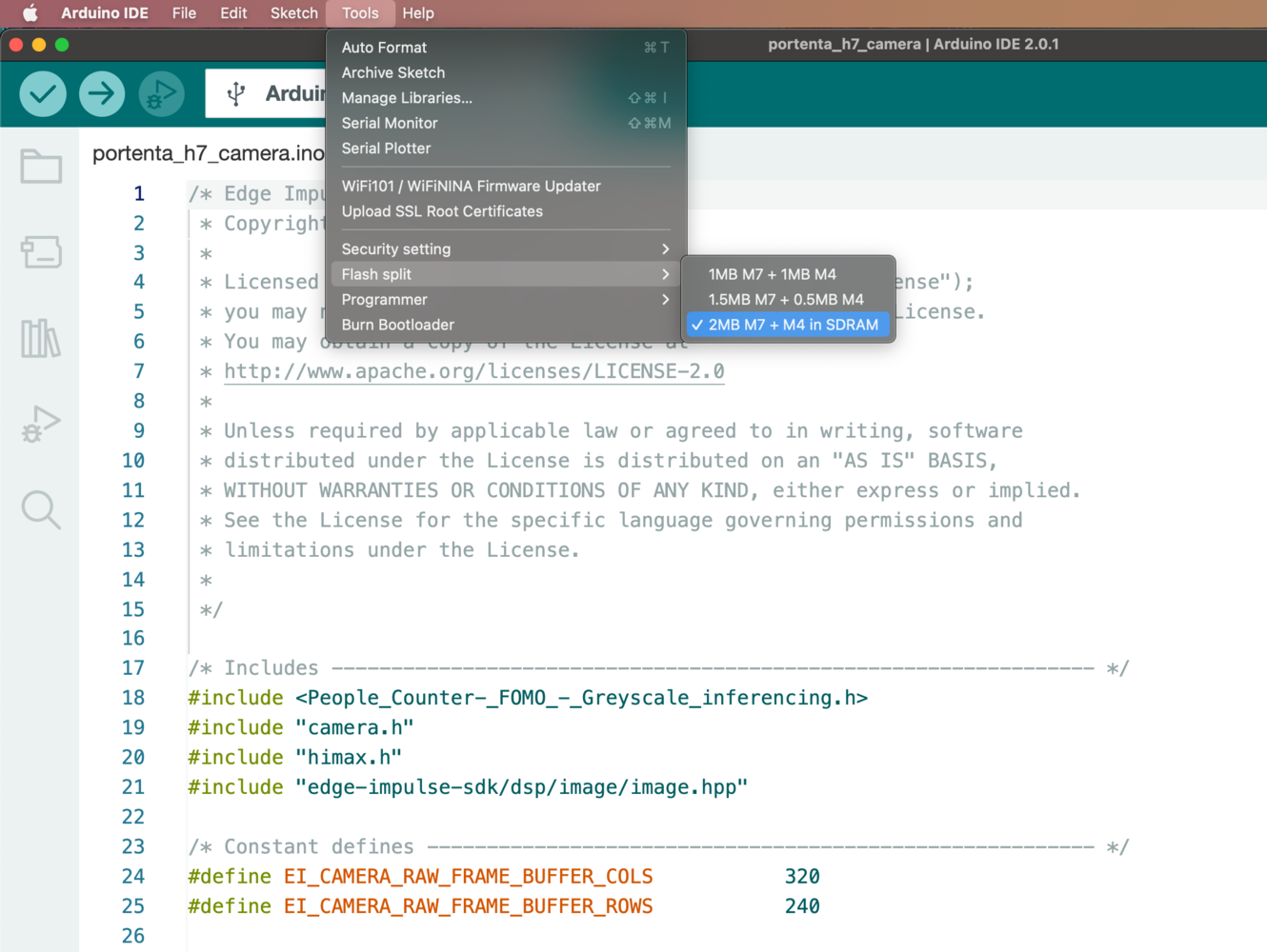 For the Arduino Portenta H7, make sure to install the Arduino Mbed OS Portenta Boards v2.8.0 and to select the Arduino Portenta H7 (M7 core) board and the Flash Split 2 MB M7 + M4 in SDRAM: