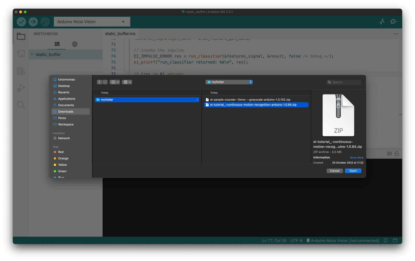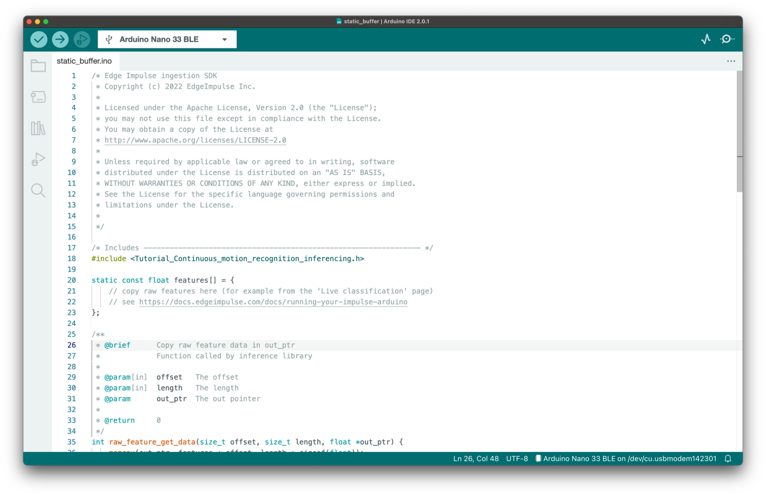 Then, load an example by going to File > Examples > Your project name - Edge Impulse > static_buffer > static_buffer.