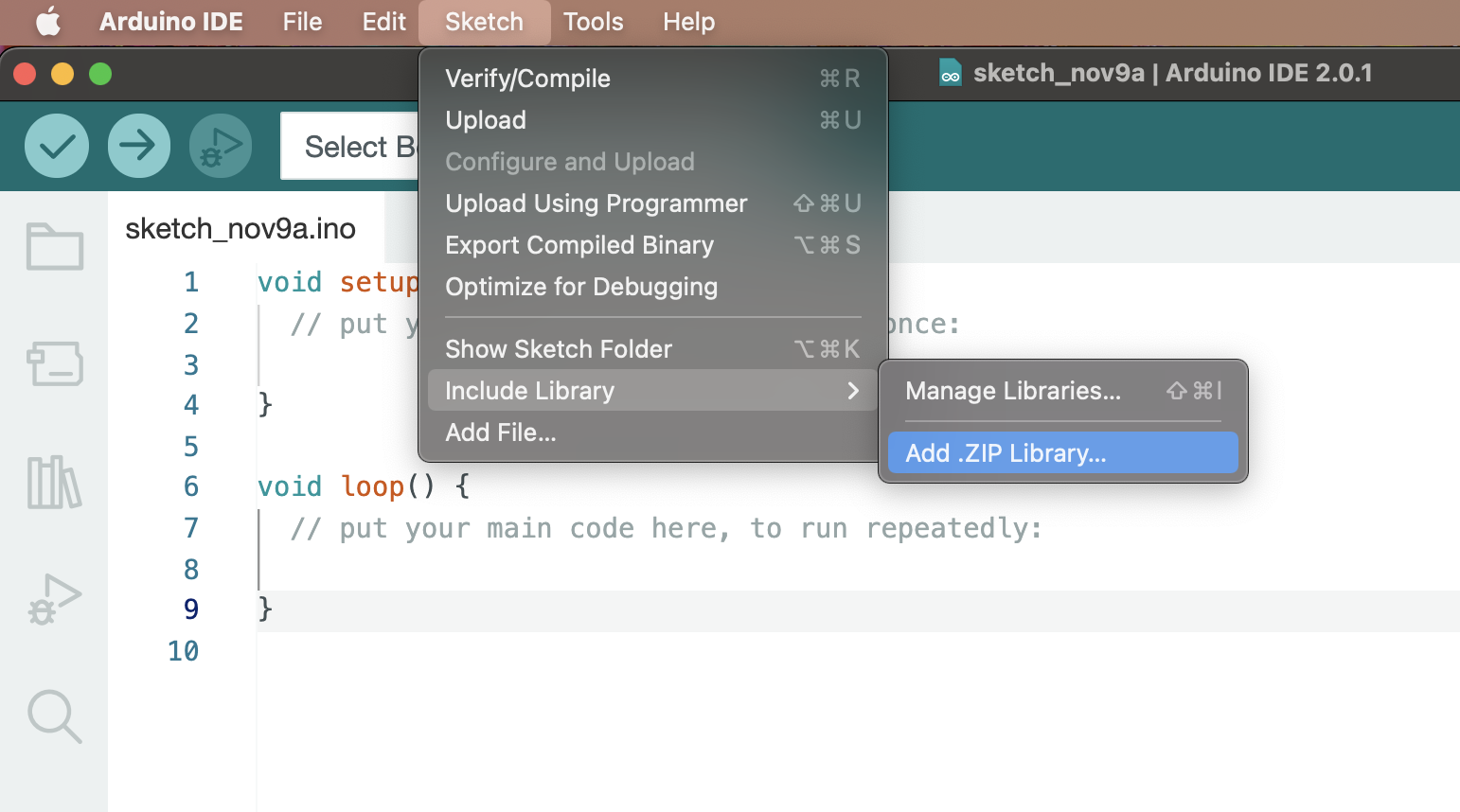 Choose Sketch > Include Library > Add .ZIP library….