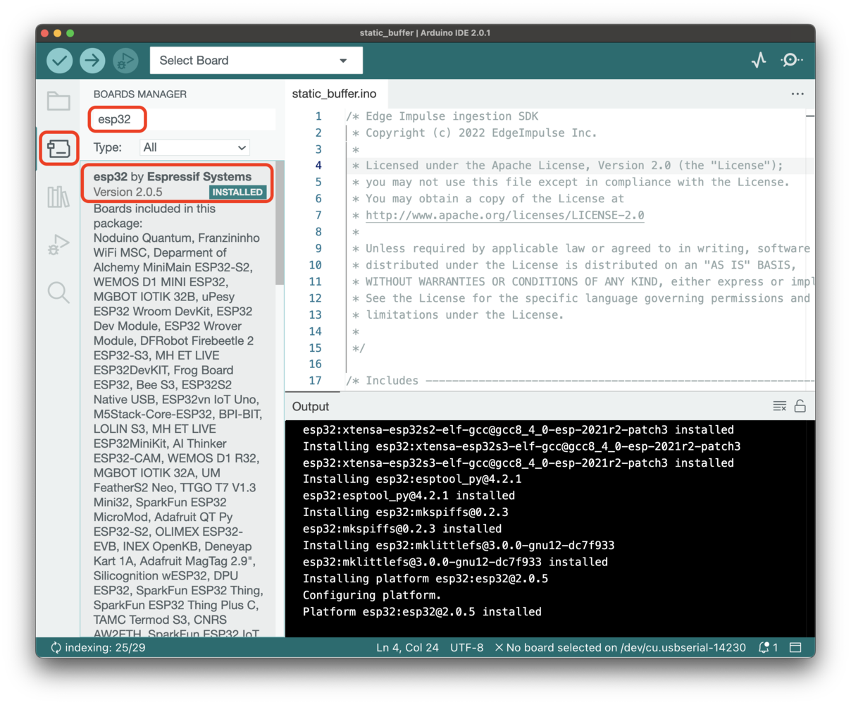 We also provide examples for all the officially supported targets that include sampling the raw features from the onboard sensors. To use them, make sure to install the right development board underTools->Boards->Boards Manager. We officially support:
