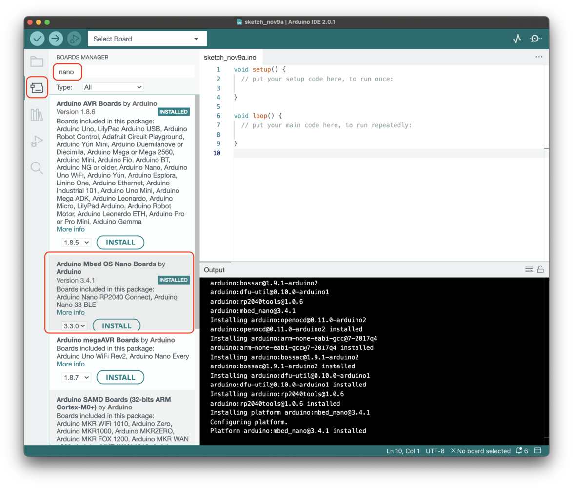 For the Arduino Nano 33 BLE Sense, install the following board: