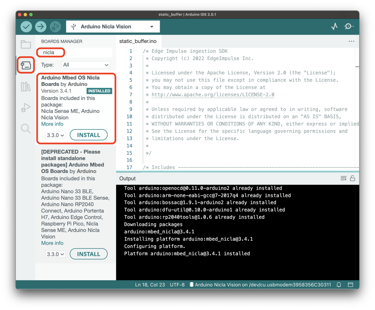 For the Arduino Nicla Vision and the Arduino Nicla Sense ME, install the following board:
