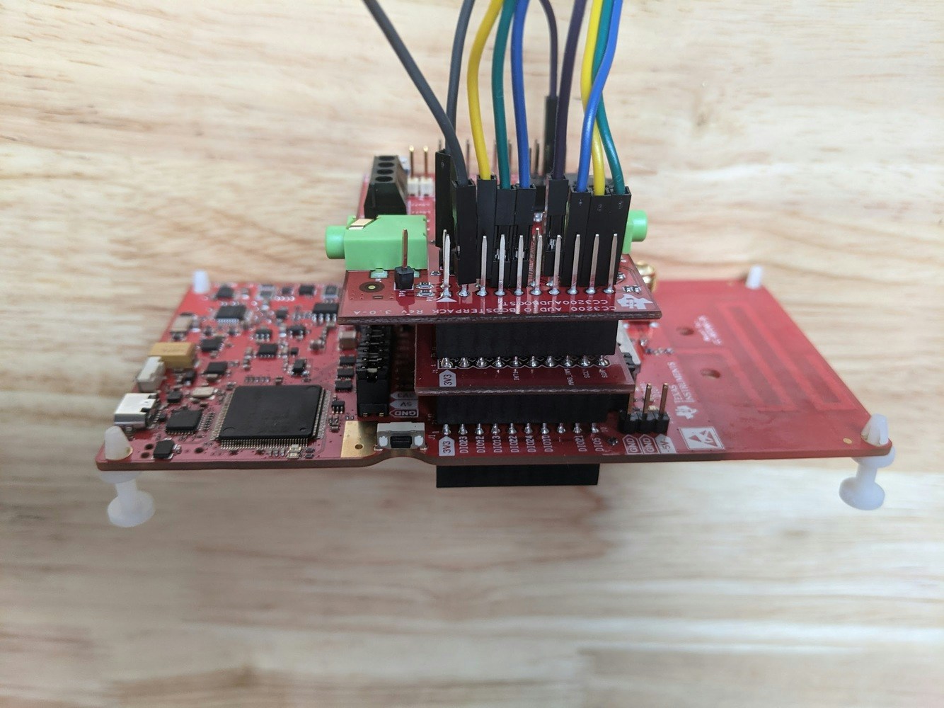 Connect the audio booster pack on top of the sensors booster pack. The final board should appear as shown below: