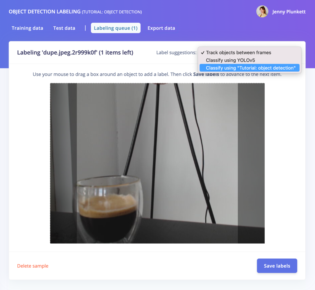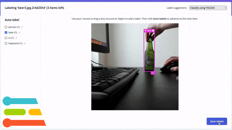 Common objects in your images can quickly be identified and labeled in seconds without needing to write any code by using a pre-trained YOLOv5 object detection model, trained on 80 classes from the COCO dataset. To label your objects with YOLOv5, click the Label suggestions dropdown and select “Classify using YOLOv5.” If your object is more specific than what is auto-labeled by YOLOv5, e.g. “coffee” instead of the generic “cup” class, you can modify the auto-generated labels.