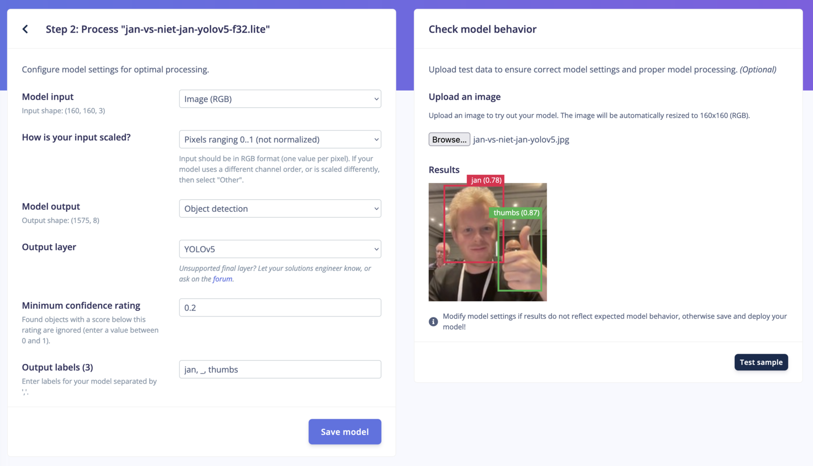 - Select your model file (e.g. in ONNX or TFLite format), tell a bit about your model, and verify that the model gives correct suggestions via “Check model behavior”.