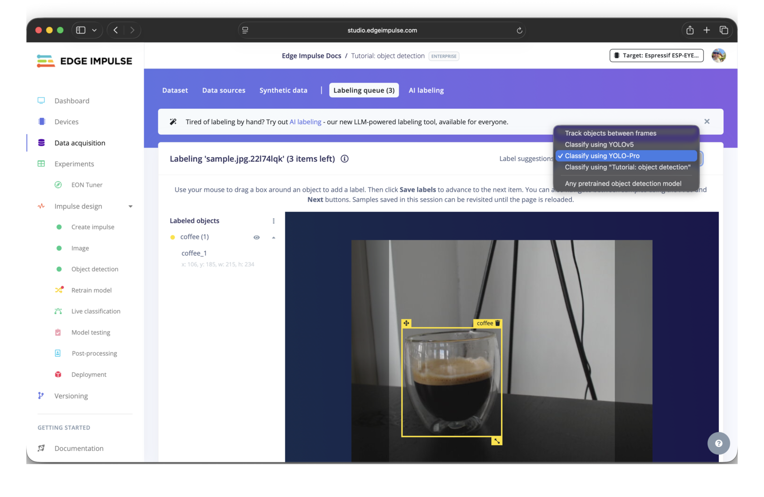 This only works with object detection models outputting bounding boxes. Centroid-based models (such as FOMO) won’t work. To label using a pretrained objection model:- Create a new (second) Edge Impulse project.