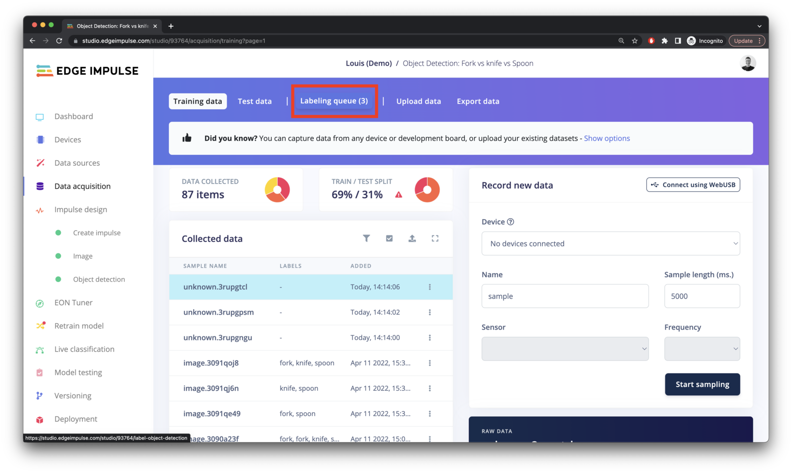 - When you’re done labeling, go to Data acquisition > Export data and export your (now labeled) dataset.