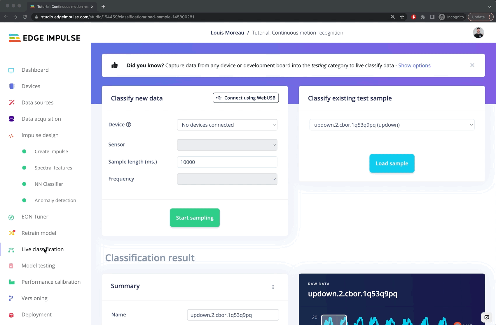 With the project ready it’s time to verify that the application works. Head back to the studio and click on Live classification. Then load a validation sample, and click on a row under ‘Detailed result’.