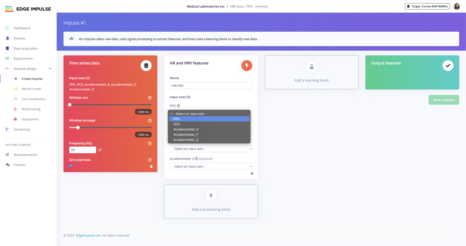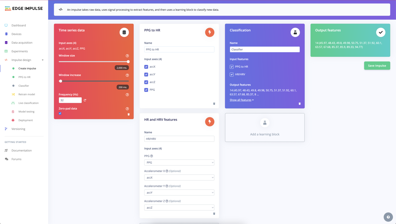 - Edge Impulse will generate the features for both heart rate and HRV over the specified window size.