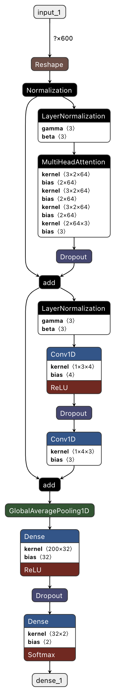 The key building block of a Transformer model is the Keras MultiHeadAttention layer. As part of a recent release the Edge Impulse SDK now supports this layer. The Transformer based models are usually large models. The Arduino Giga R1 WiFi has 1 MB RAM divided into 2 cores (M7/M4). The main core (M7) has 512 KB RAM. To fit the model into the available memory with other overheads we needed to slim down the architecture by defining 1 transformer block with 2 attention heads (size = 64). Also, reducing the dimension (units) of the penultimate Dense layer helps in keeping the model size within the limits. The aforementioned hyperparameters have been chosen after many training trials and keeping the optimal model size, without losing much accuracy. The 4000ms of 3-axis accelerometer raw time-series data are fed into the Input layer. We have added a Normalize layer with pre-calculated mean and variance for each channel from the training datasets. The Transformer model is capable to learn features from the raw time series data while training. Below is the final model summary.