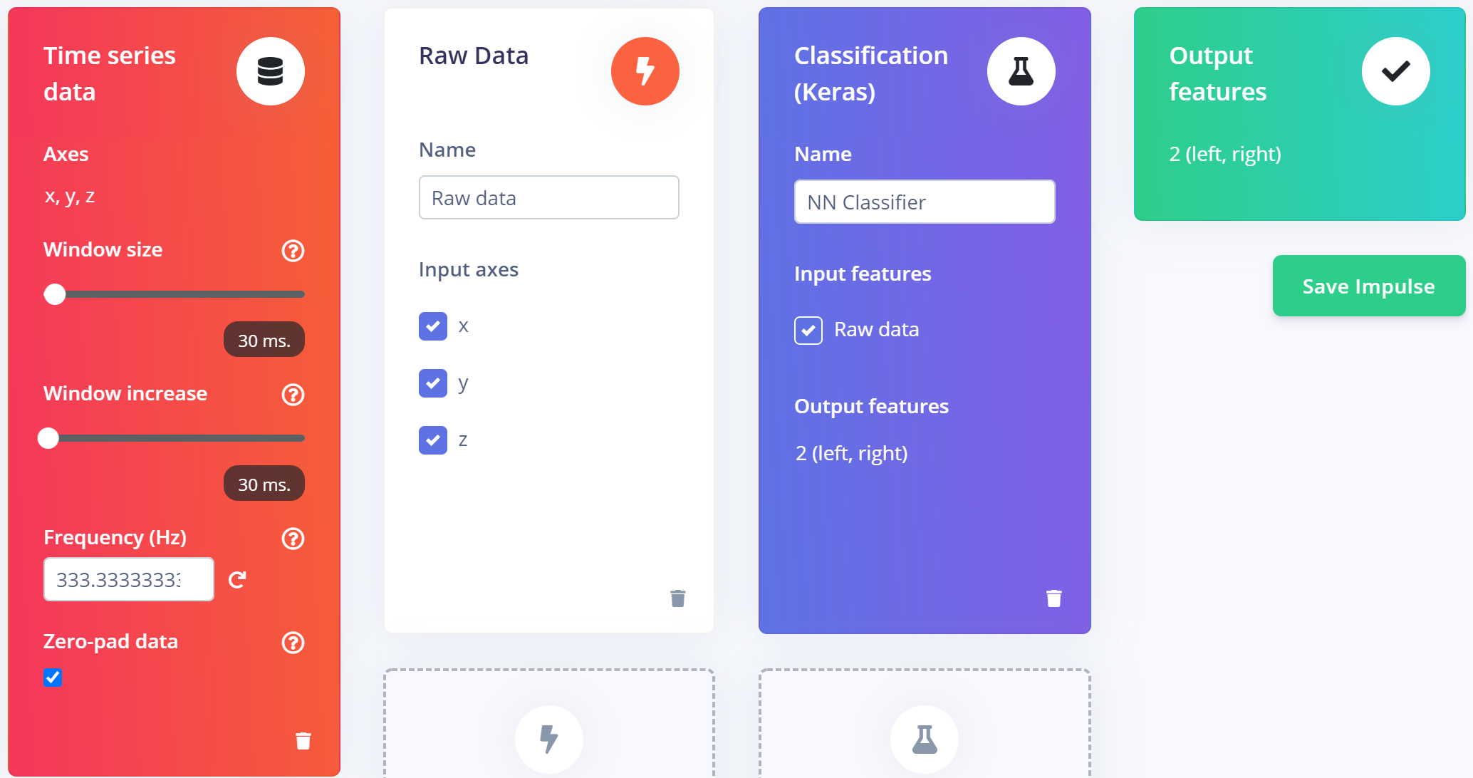 An impulse takes raw data, uses signal processing to extract features, and then uses a learning block to classify new data. These steps will create an impulse.- Click