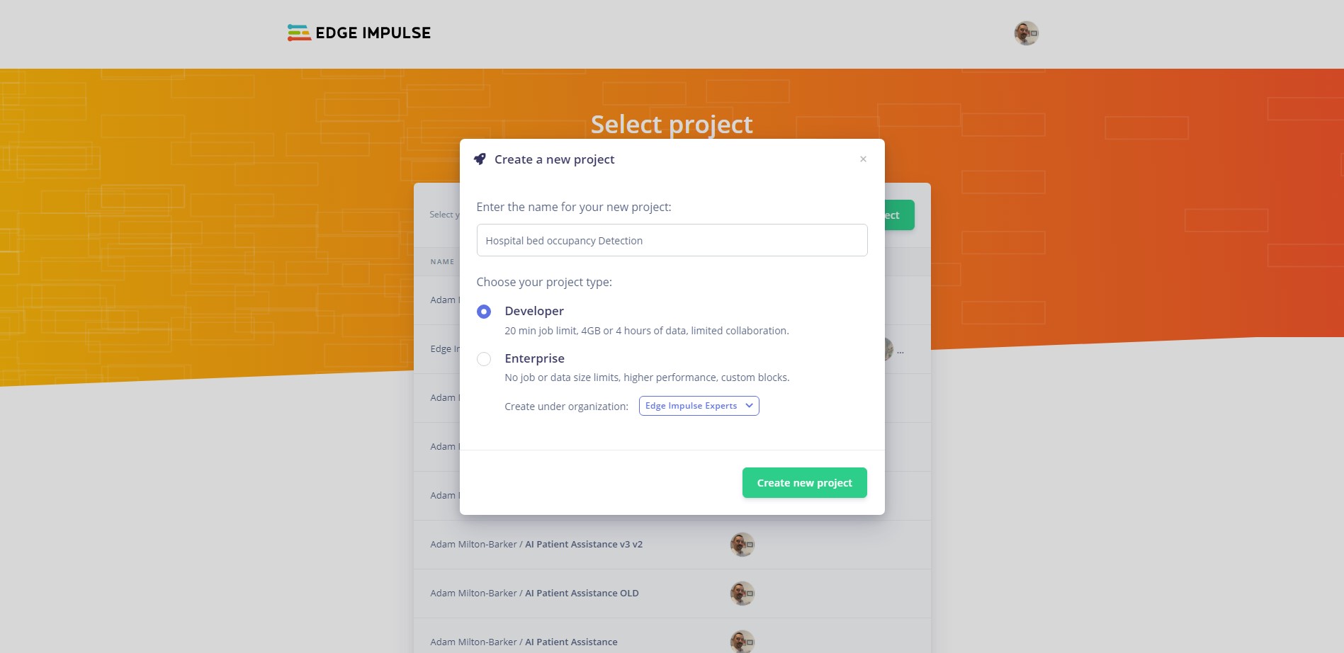 Head over to Edge Impulse and create your account or login. Once logged in you will be taken to the project selection/creation page.Create New Project