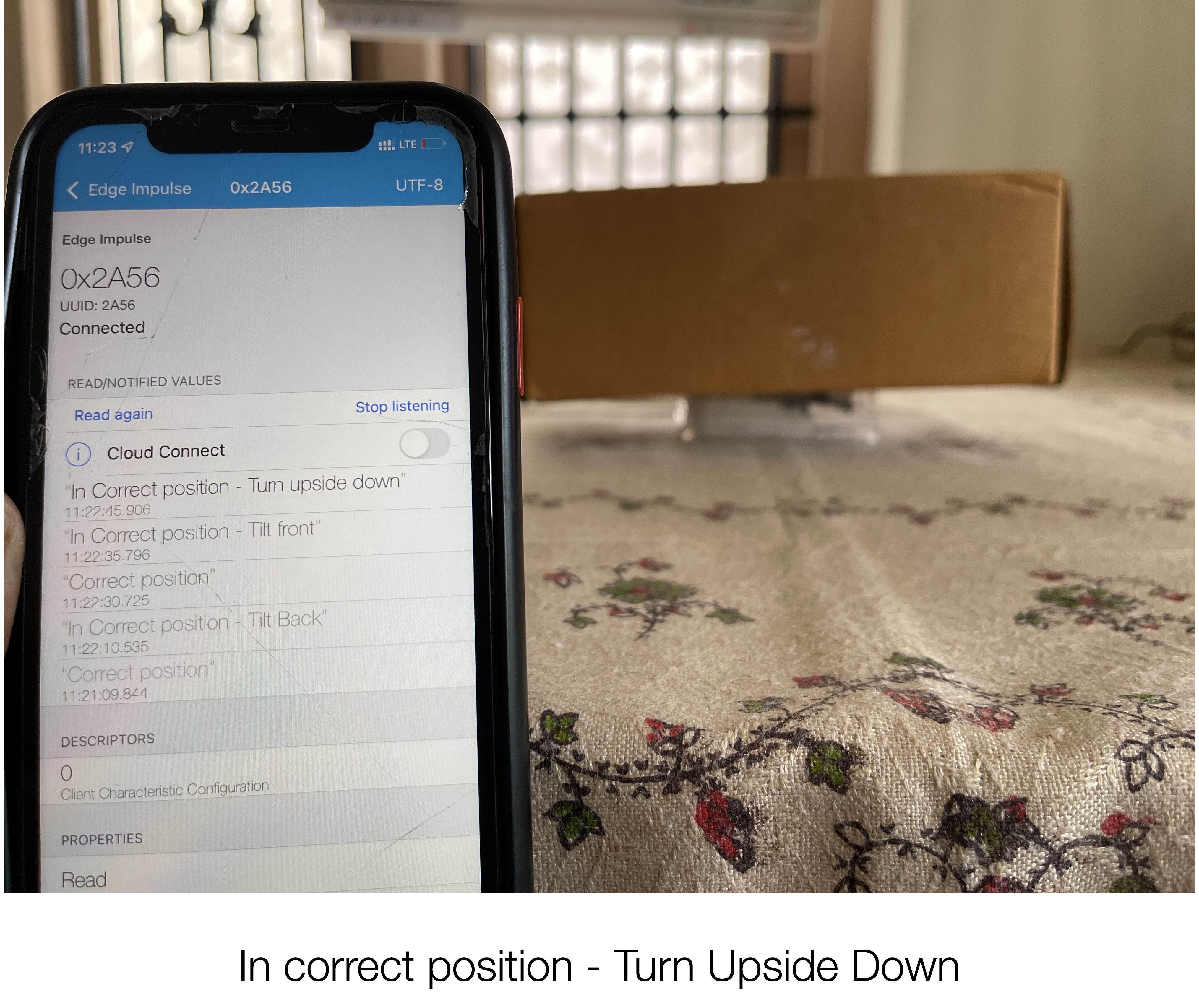 Let’s assume the package with fragile object is orientated correctly. Place the Thunderboard on top of it, for data acquisition. Now start moving the package with this position, while data acquisition is running. Collect a dataset of around 2 minutes 30 seconds.