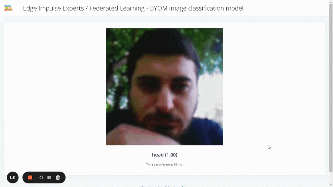 We can go to the provided URL (Raspberry Pi’s IP address at port 4912) and we will see the feed being captured by the camera as well as the model’s predictions. At this point I used a 3D printed support to hold the Raspberry Pi camera upright and then projected the test images to the camera.