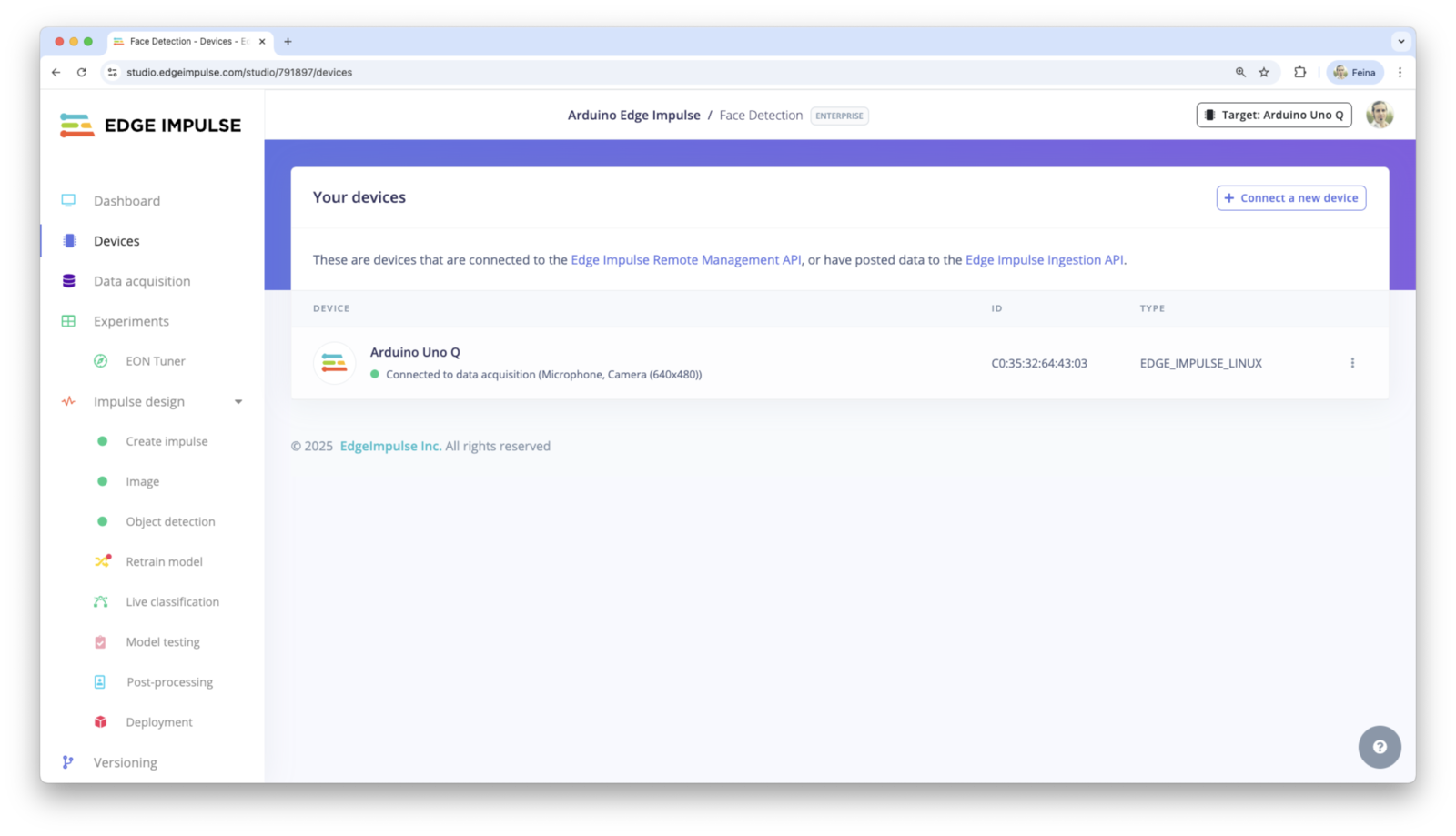 To set this device up in Edge Impulse, run the following commands from the Arduino UNO Q Terminal or via adb:Connecting to Edge Impulse