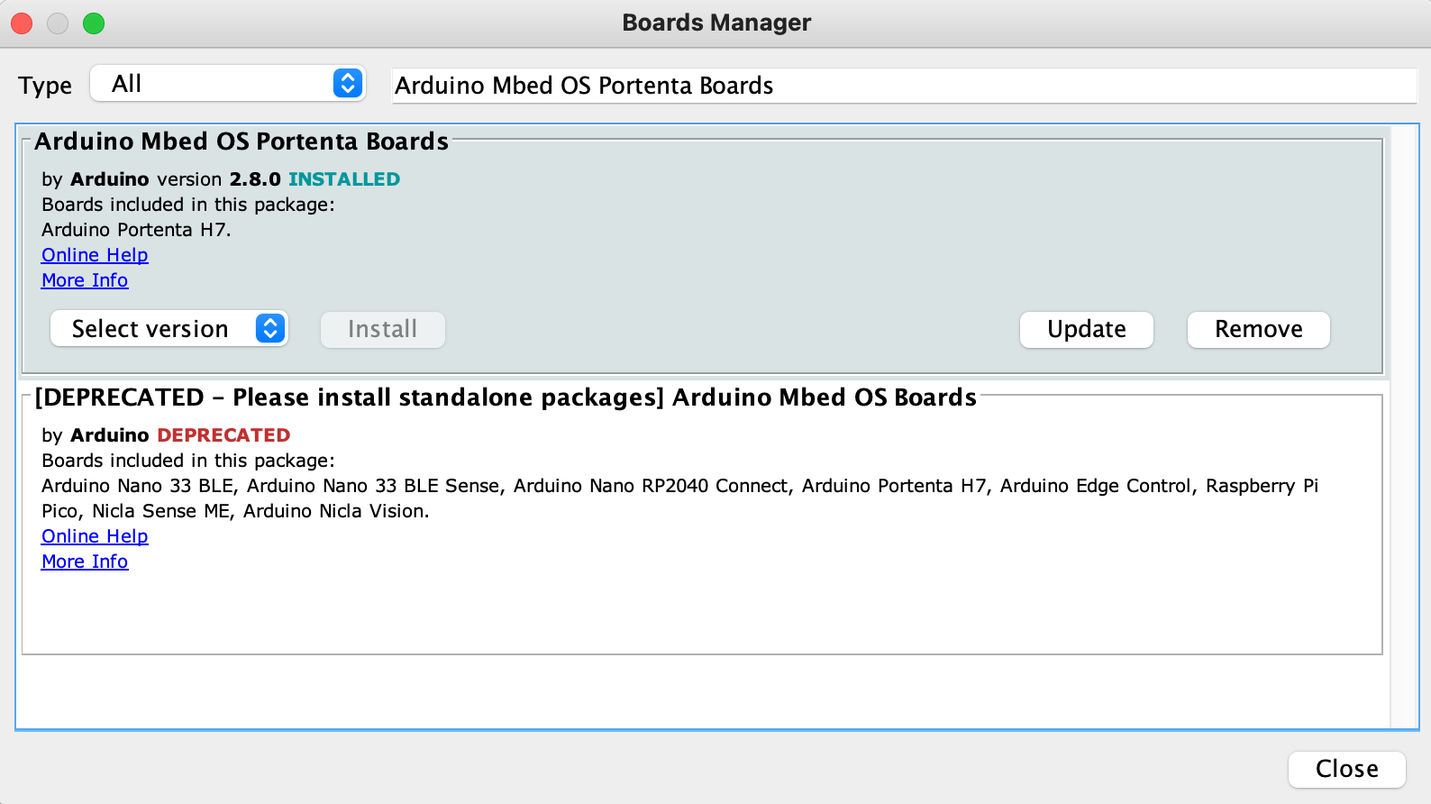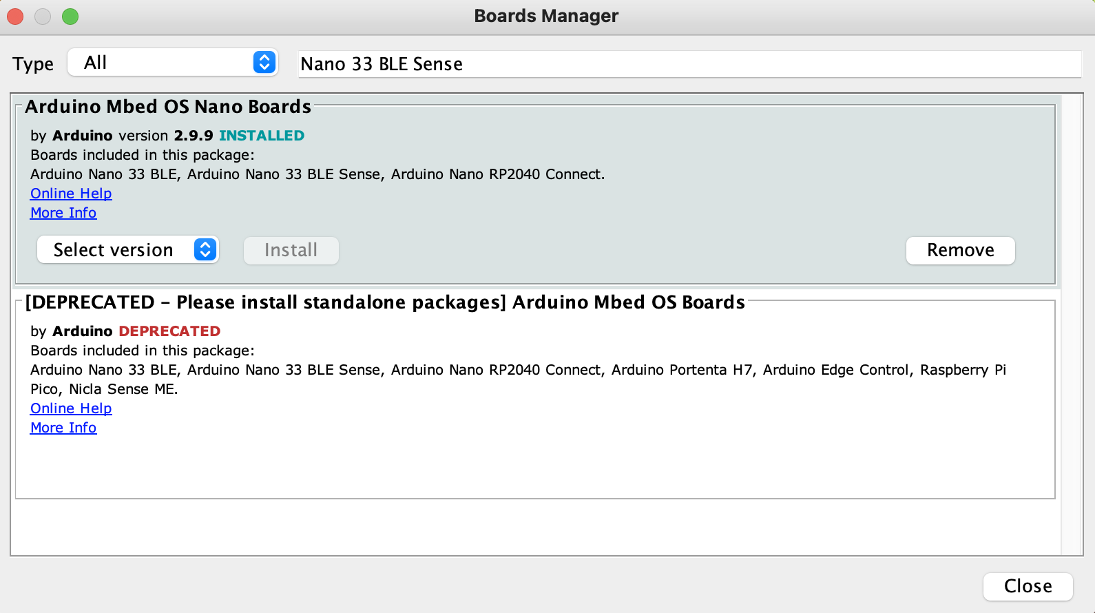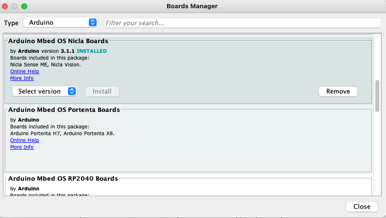 For the Arduino Nano 33 BLE Sense, install the following board: