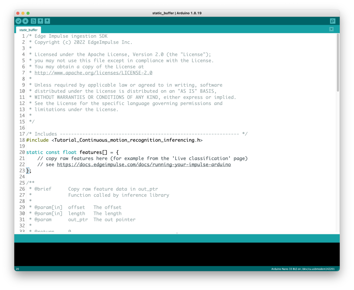 A demonstration on how to plug sensor values into the classifier can be found here: Data forwarder - classifying data (Arduino).Troubleshooting