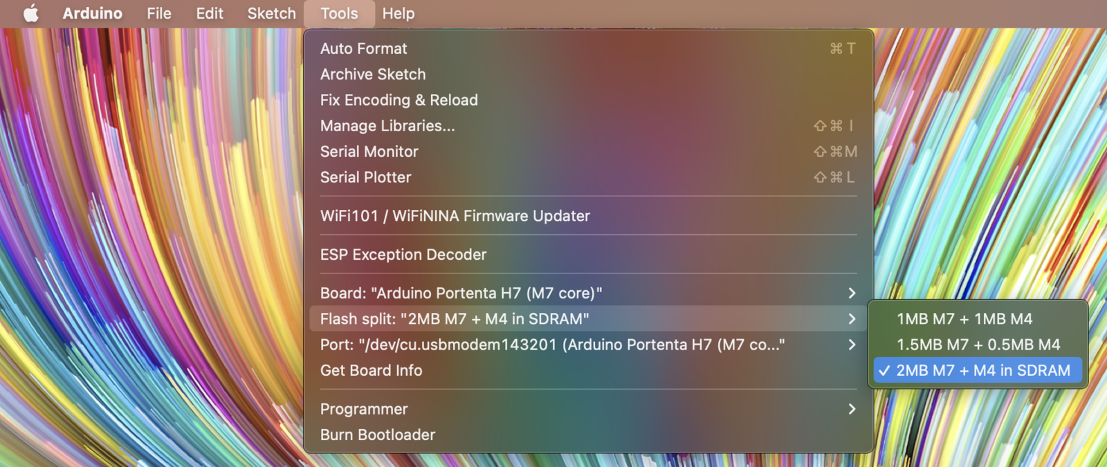 For the Arduino Portenta H7, make sure to install the Arduino Mbed OS Portenta Boards v2.8.0 and to select the Arduino Portenta H7 (M7 core) board and the Flash Split 2 MB M7 + M4 in SDRAM: