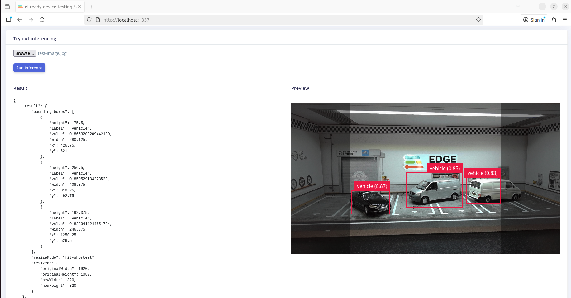 Running the command below on the target will prompt you to log in to your edge impulse account, select the project, download the model and start inference in one go. Here you can select the project that you copied in the beginning of this guide. When the runner is working correctly you should get output on the terminal like shown below. A webserver will be started on port 1337 to which you can upload this test-image.jpg to test an inference.