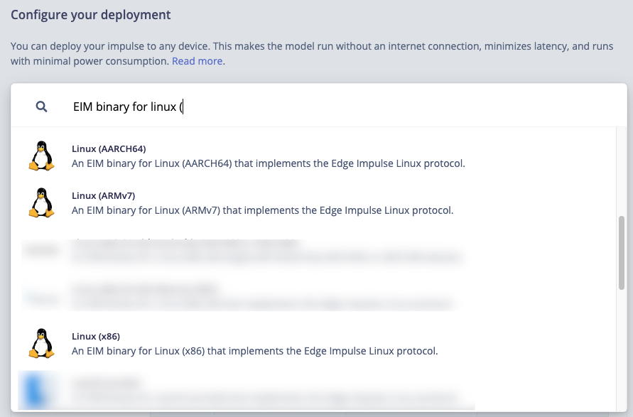 Navigate to the deployment page of the project in Edge Impulse platform and select Linux option appropriate for your architecture. Many deployment options are available, so choose an option that is appropriate for your target (e.g., its a Qualcomm SoC with Hexagon NPU, etc). If you intend to running your model on a general purpose CPU without AI acceleration it is generally best to select AARCH64 or x86 as your deployment option.