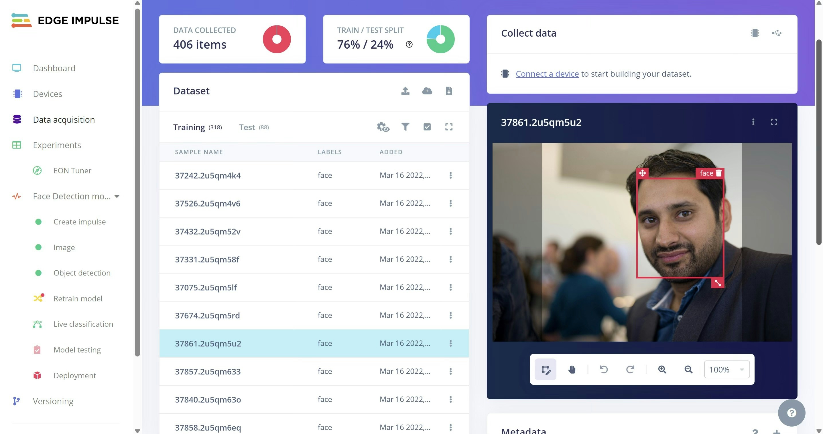 - Upload ~100 images containing faces. Draw a square around each face and label it as “face”