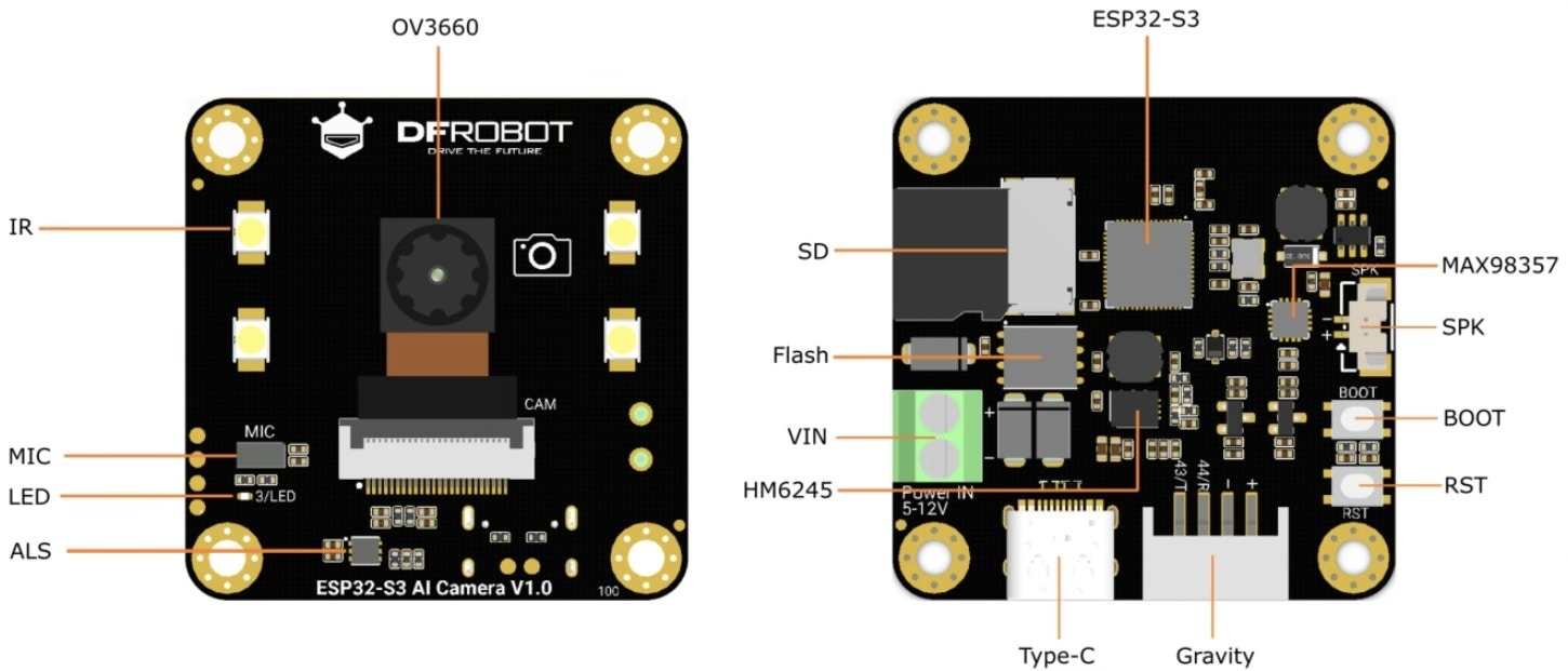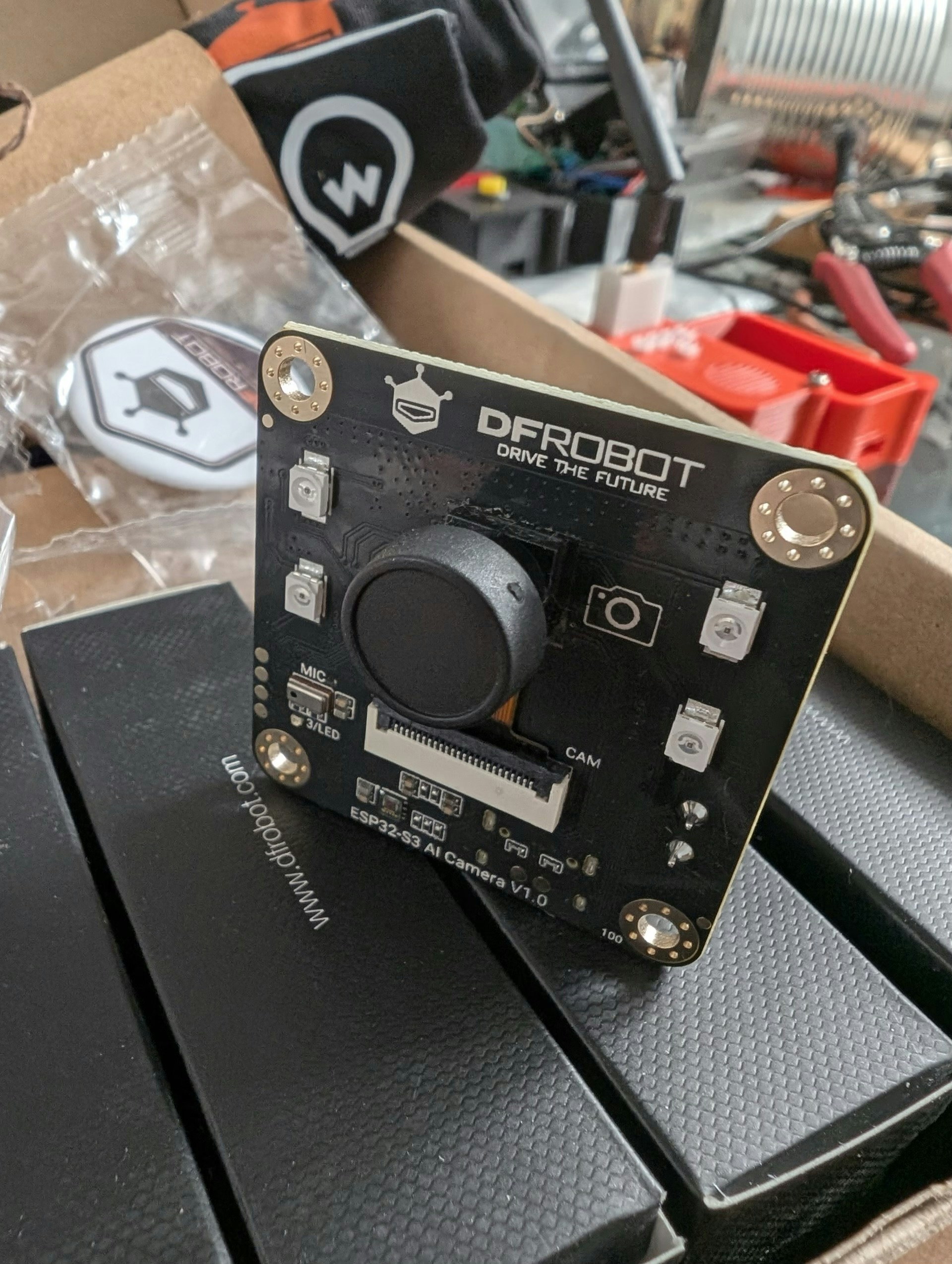 For this project, I use the ESP32S3 AI Camera module 1.0 (DFR1154) by DFRobot and a microSD card. The AI Camera Module is a 1.5” x 1.5” ESP32-based board featuring:- A 2MP OV3660 wide IR camera