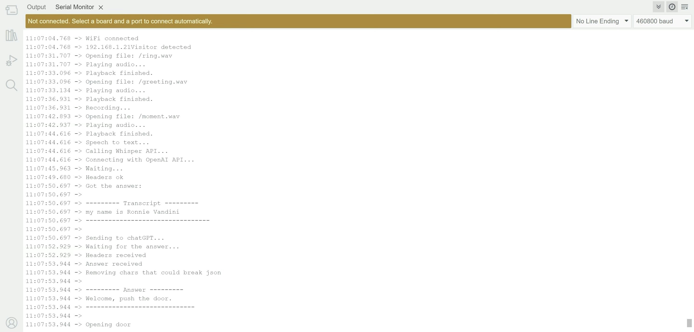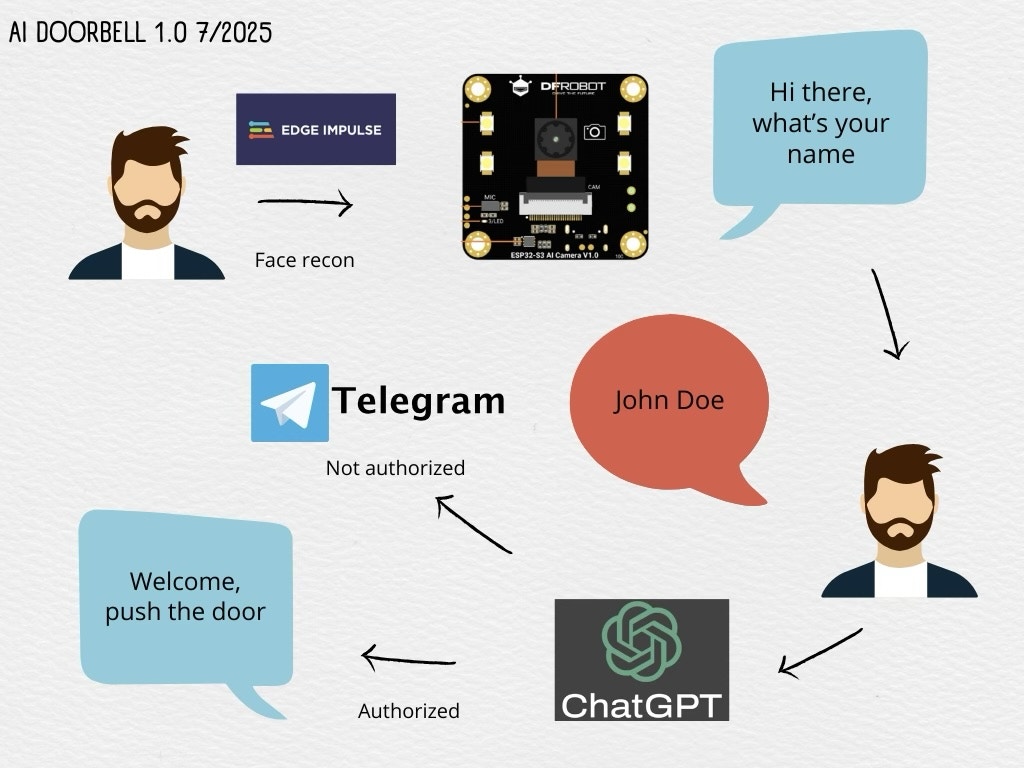 - The transcription is sent to ChatGPT, which decides whether to open the door (via relay) or notify remotely via Telegram.