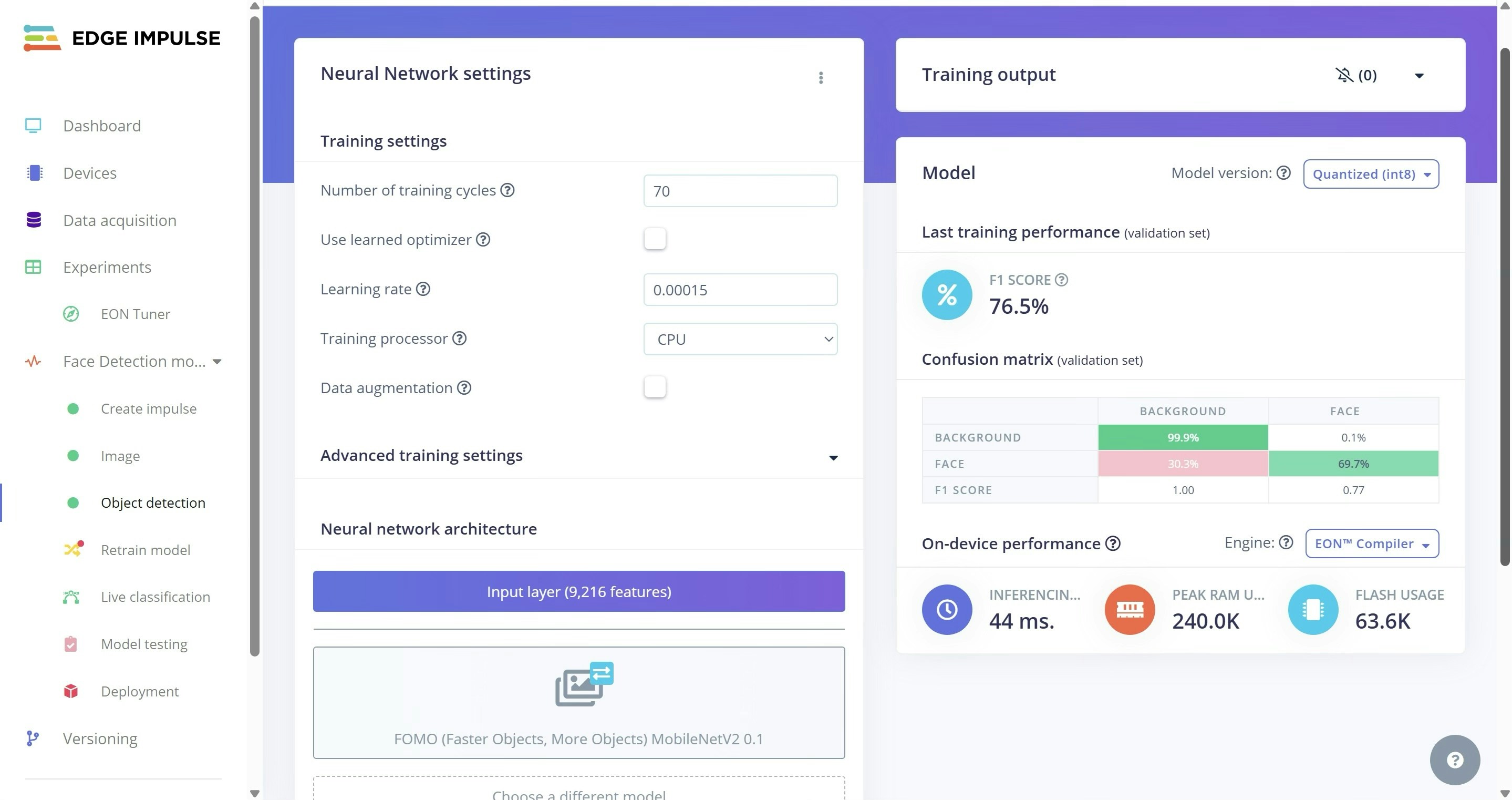 - Train the model. (In my case, 70 cycles and a learning rate of 0.00015 yielded a 0.77 F1 score — your mileage may vary.)