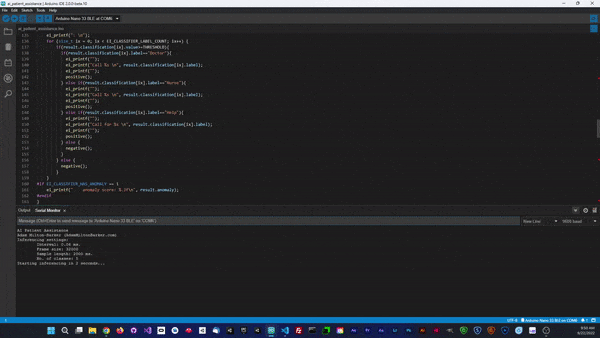 A well known field of Artificial Intelligence is voice recognition. These machine learning and deep learning models are trained to recognize phrases or keywords, and combined with the Internet of Things can create fully autonomous systems that require no human interaction to operate. As technology has advanced, it is now possible to run voice recognition solutions on low cost, resource constrained devices. This not only reduces costs considerably, but also opens up more possibilities for innovation. The purpose of this project is to show how a machine learning model can be deployed to a low cost IoT device (Arduino Nano 33 BLE SENSE), and used to notify staff when a patient needs their help. The device will be able to detect three keywords Doctor, Nurse, and Help. The device also acts as a BLE peripheral, BLE centrals/masters such as a central server for example, could connect and listen for data coming from the device. The server could then process the incoming data and send a message to hospital staff or sound an alarm.Hardware