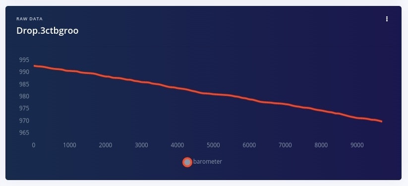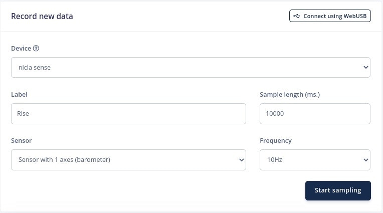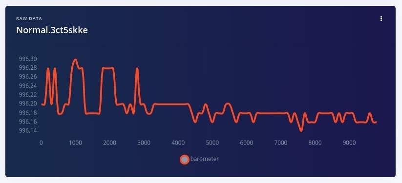 Download the Edge Impulse ingestion sketch from here and upload it to your board. We will collect data for three classes:- Drop - This class will be used to detect bad weather conditions. A quick drop in air pressure indicates the arrival of a low-pressure system, in which there is an insufficient force to push clouds or storms away. Cloudy, wet, or windy weather is connected with low-pressure systems, as explained here.