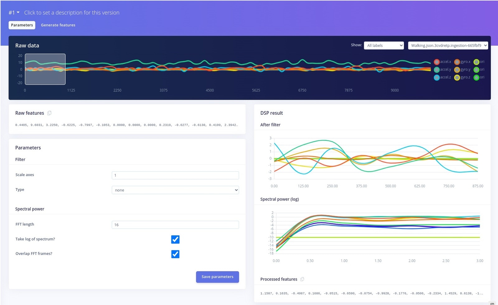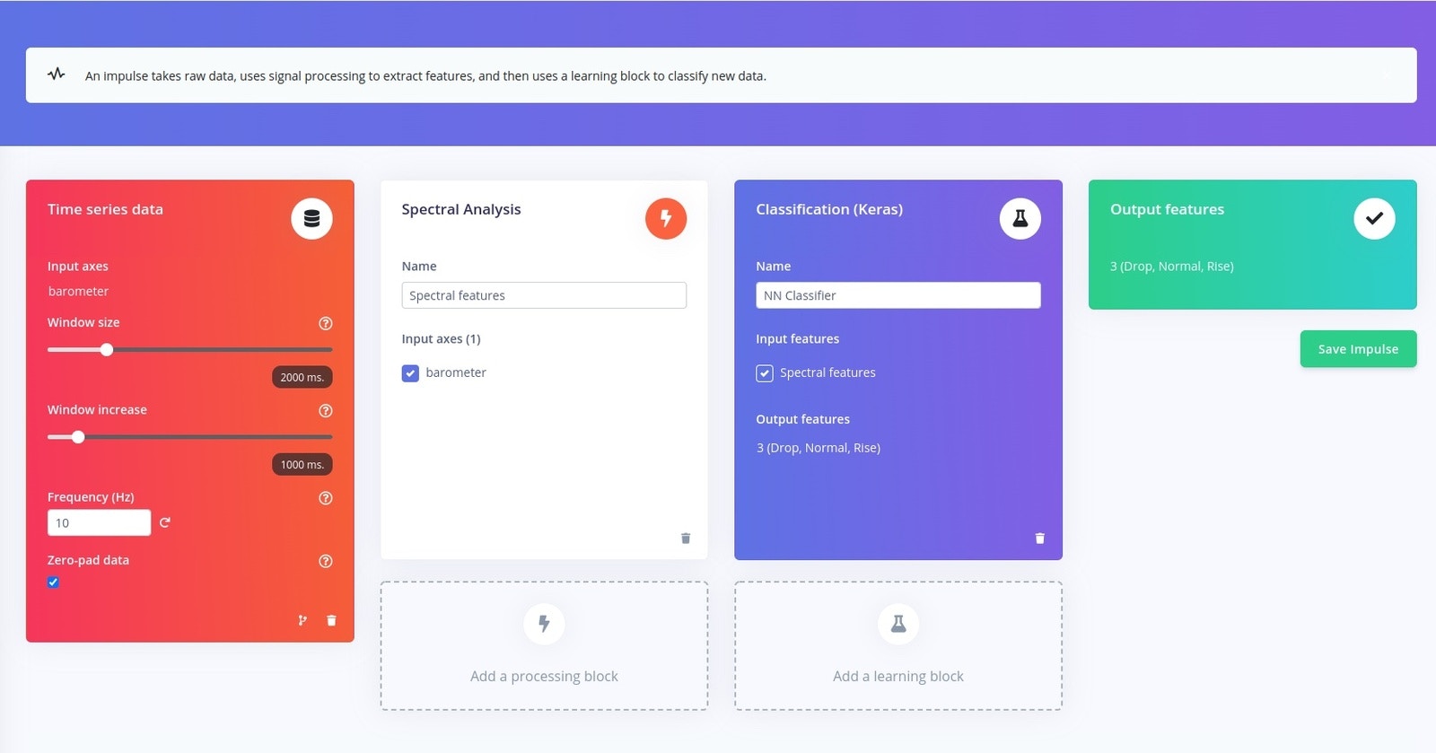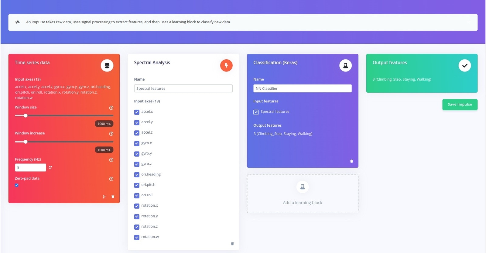 Now that you have enough training data, you can design the impulse. Go to Impulse design > Create impulse on Edge Impulse and add a Spectral Analysis processing block and a Classification (Keras) learning block. An impulse consists of a signal processing block used to extract features from the raw input data, and a learning block which uses these features to classify new data. The Spectral Analysis signal processing block applies a filter to remove noise, performs spectral analysis on the input signal, and extracts frequency and spectral power data. The Classification (Keras) learning block is trained on these spectral features and learns to identify patterns in the data that indicate which class a new data point should belong to.