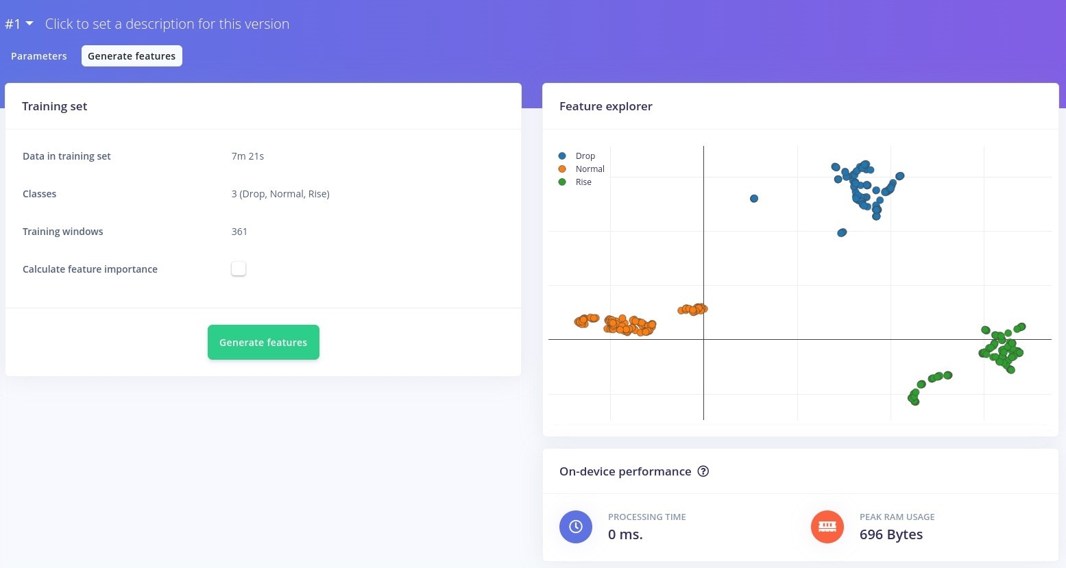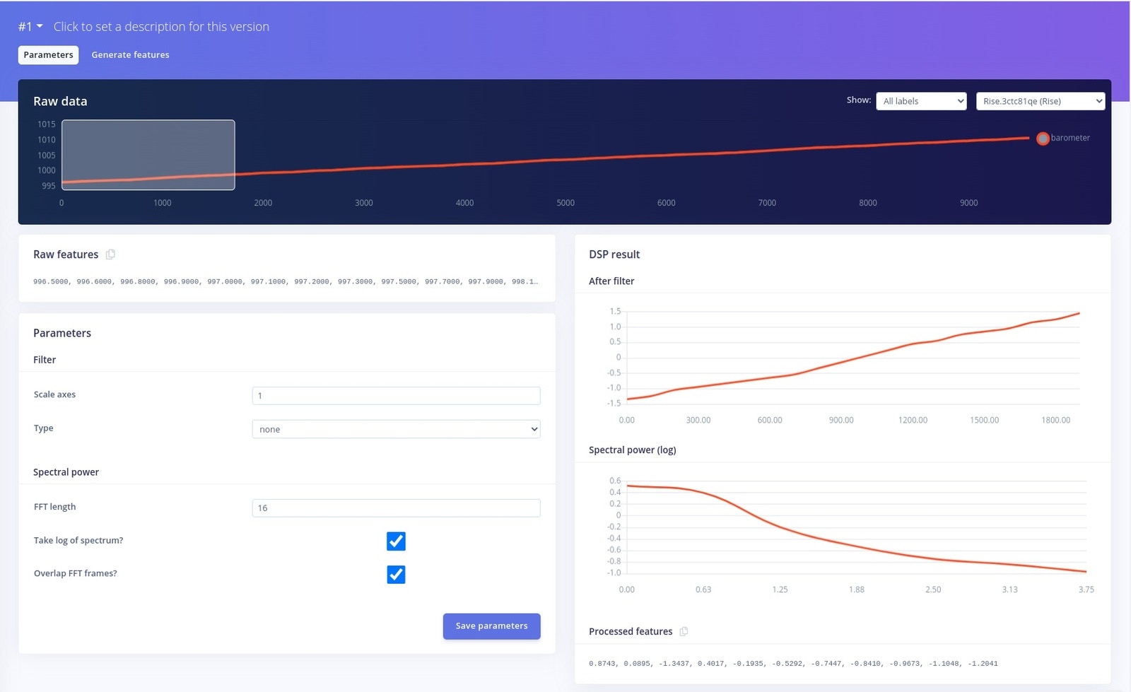 function which sends data through a serial connection to your computer, which then forwards it to Edge Impulse. Depending on which class you want to collect data for, you’ll have to uncomment the corresponding line of code from the code snippet below. Since collecting enough real weather data for training the model would take a lot of time and is weather-dependent, for the purpose of this tutorial we will simulate the Rise and Drop classes using the barometerValueHigh()