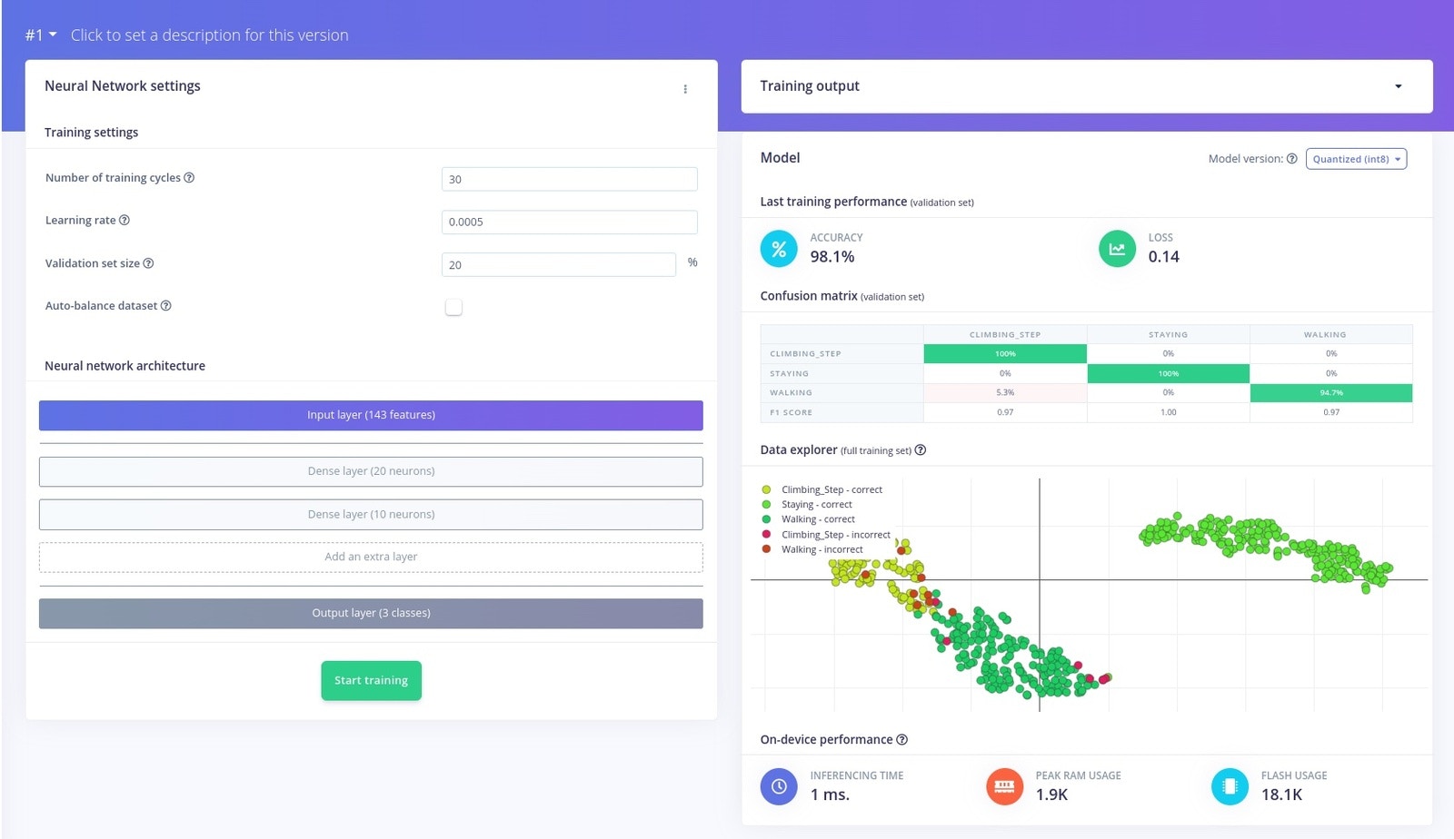 Now go to NN Classifier and start training the model. At the end of the training you’ll see the accuracy and the loss of the model. A good performing model will have a high accuracy and a low loss. In the beginning, you can use the default training settings and adjust them later if you are not satisfied with the performance results.