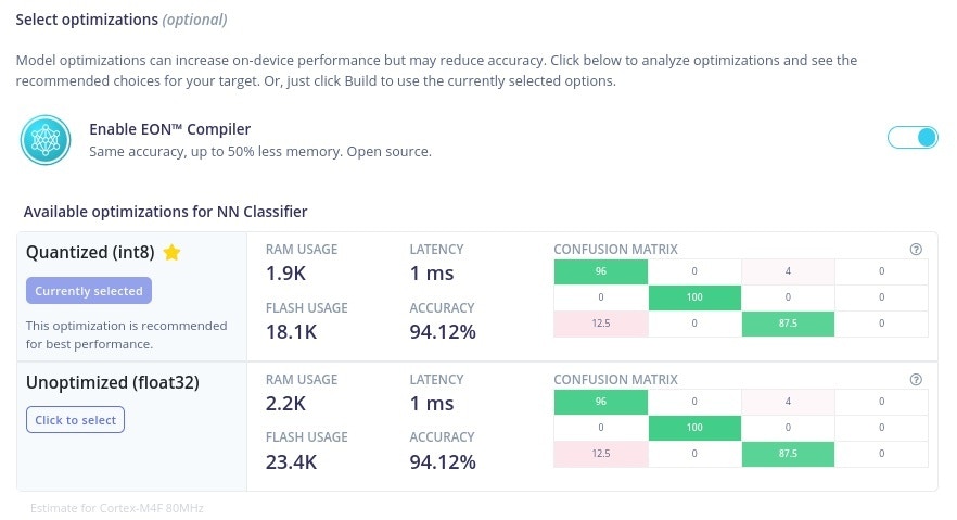 Now you can deploy your model as an Arduino library by going to Deployment > Create library > Arduino library. You can also enable the EON Compiler to optimize the model.