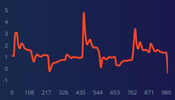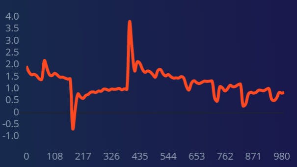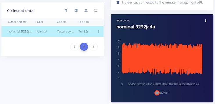 Collecting data We need to collect data to train our machine learning model. For this tutorial we will be recording only nominal performance. That means there is no need to perform fault simulation in order to detect “faulty” data, which can be an intrusive and dangerous process. The anomaly detection model will tell us when the power signal from the motor is behaving in a way that the model hasn’t seen before. There are plenty of ways to upload training data using Edge Impulse. For example, it’s possible to upload .CSV files with the relevant data, or you can use the convenient Edge Impulse Data Forwarder to stream data live over serial, which is what we’ll be doing in this tutorial. Let’s say we set a motor rotating with random changes in velocity in order to simulate the motion of a robotic arm or something of the like. Let’s take a look at 1 second of power consumption data from this motion: