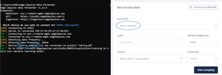 It’s recommended to check out the official guide on Edge Impulse’s data forwarder here, and check out the ODrive specific data forwarding Arduino script attached to this tutorial (“odrive_data_forwarding.ino”)!We’ll run the attached code on our Arduino while it’s connected via UART to our ODrive board. You can read about the ODrive UART interface here.