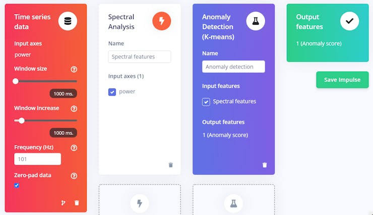 It’s time to create an impulse, which is comprised of a series of configuration / processing blocks. First up is setting the type of data we’re using, which in this case is “Time series data”. This block will split our long samples into shorter windows. Next we decide what type of processing we want performed on our data. In this tutorial we’ll be using “Spectral analysis”, which looks at the behavior of the signals in the frequency domain. Finally we decide what sort of neural network we want to feed the results of the spectral analysis to. For this we will select “Anomaly detection (K-means)”:
