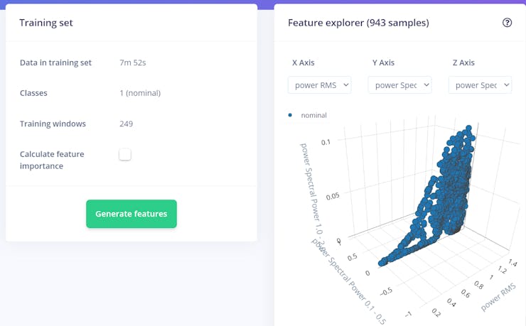 We’re ready to move on to the next block where we create our machine learning model. We’re almost done! Once we’ve generated the DSP features we can navigate to the next screen “Anomaly detection” from the menu on the left. On this screen we can set the number of clusters, as well as select the axes according to which our data will be clustered. For this example all axes were selected, but if you know that certain axes are more / less important it’s best to select them accordingly (this can be determined by using samples where the motor is experiencing faulty behavior and using the Calculate feature importance _option in the Generate features section. More on this here.)