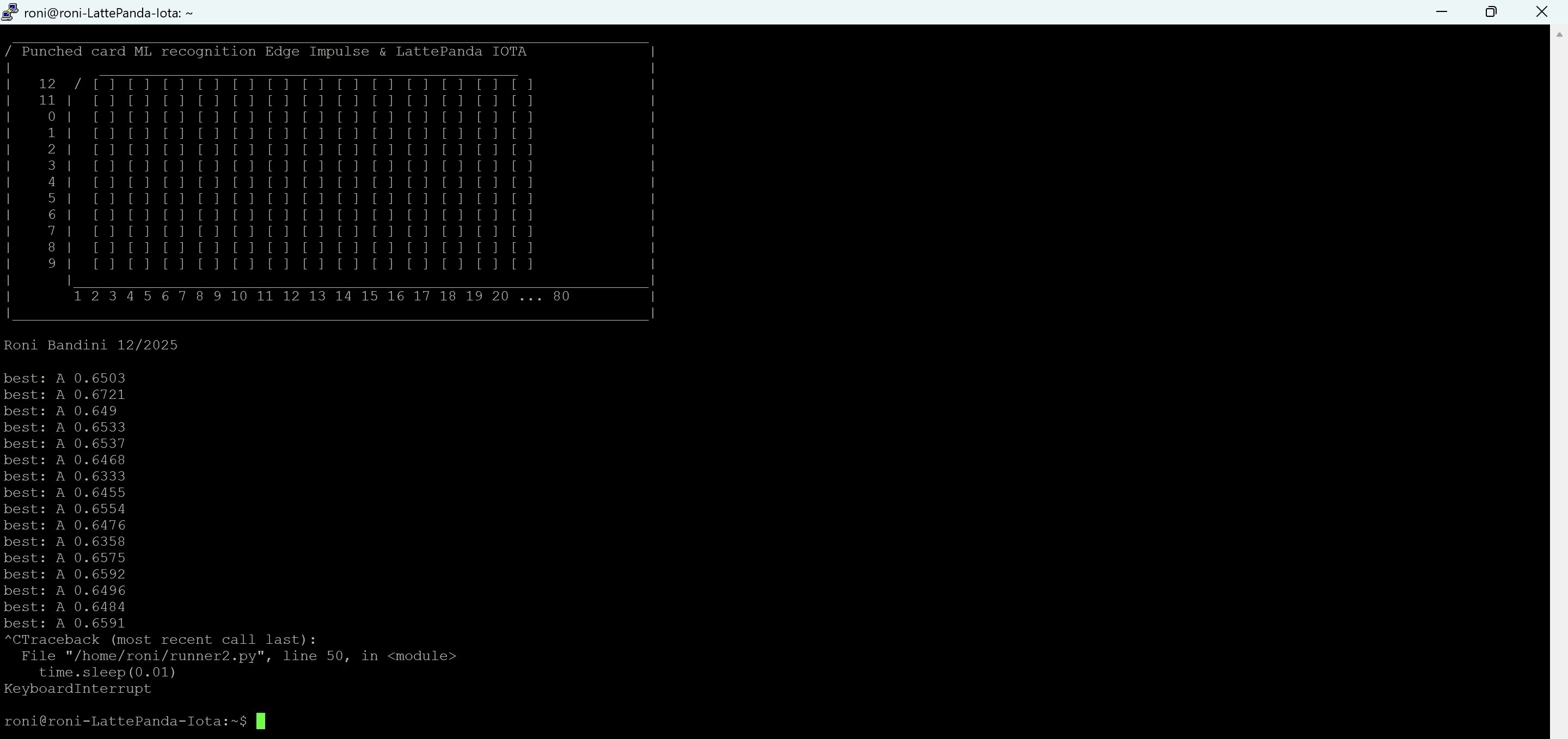 I have also included a Python script to execute the runner, capture the output, parse the result block and display the most probable character. After cloning the GitHub repo linked above, you can launch the runner with:python3 runner.py