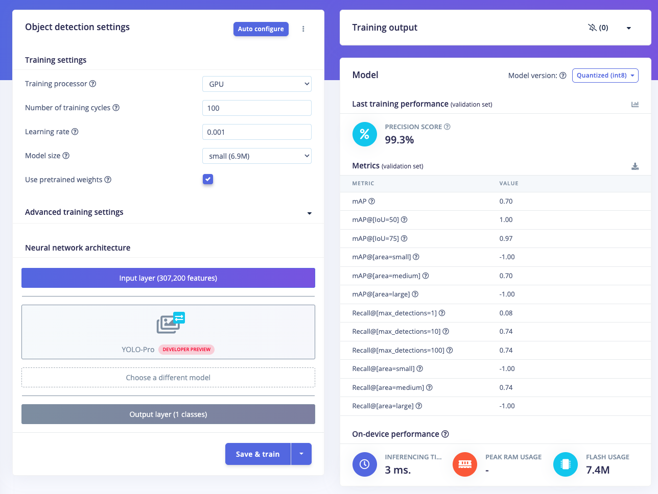 Once your labeled dataset is ready, go to Impulse Design > Create Impulse, and set the image width and height (eg. 320x320). Choose Fit shortest axis, then select Image and Object Detection as the Learning and Processing blocks, and click Save Impulse. Next, navigate to the Image Parameters section, select RGB as the color depth, and press Save parameters. After that, click on Generate, where you’ll be able to see a graphical distribution of the features. Now, move to the Object Detection section and configure the training settings. Select GPU and set the training cycles to around 100, learning rate to 0.001, and Medium for the model size. Choose YOLO-Pro as the NN architecture. Once done, start training by pressing Start, and monitor the progress. If everything goes well and the precision result is more than 90%, proceed to the next step. Go to the Model Testing section, click Classify all, and if the result is around 90%, you can move on to the final step — Deployment.