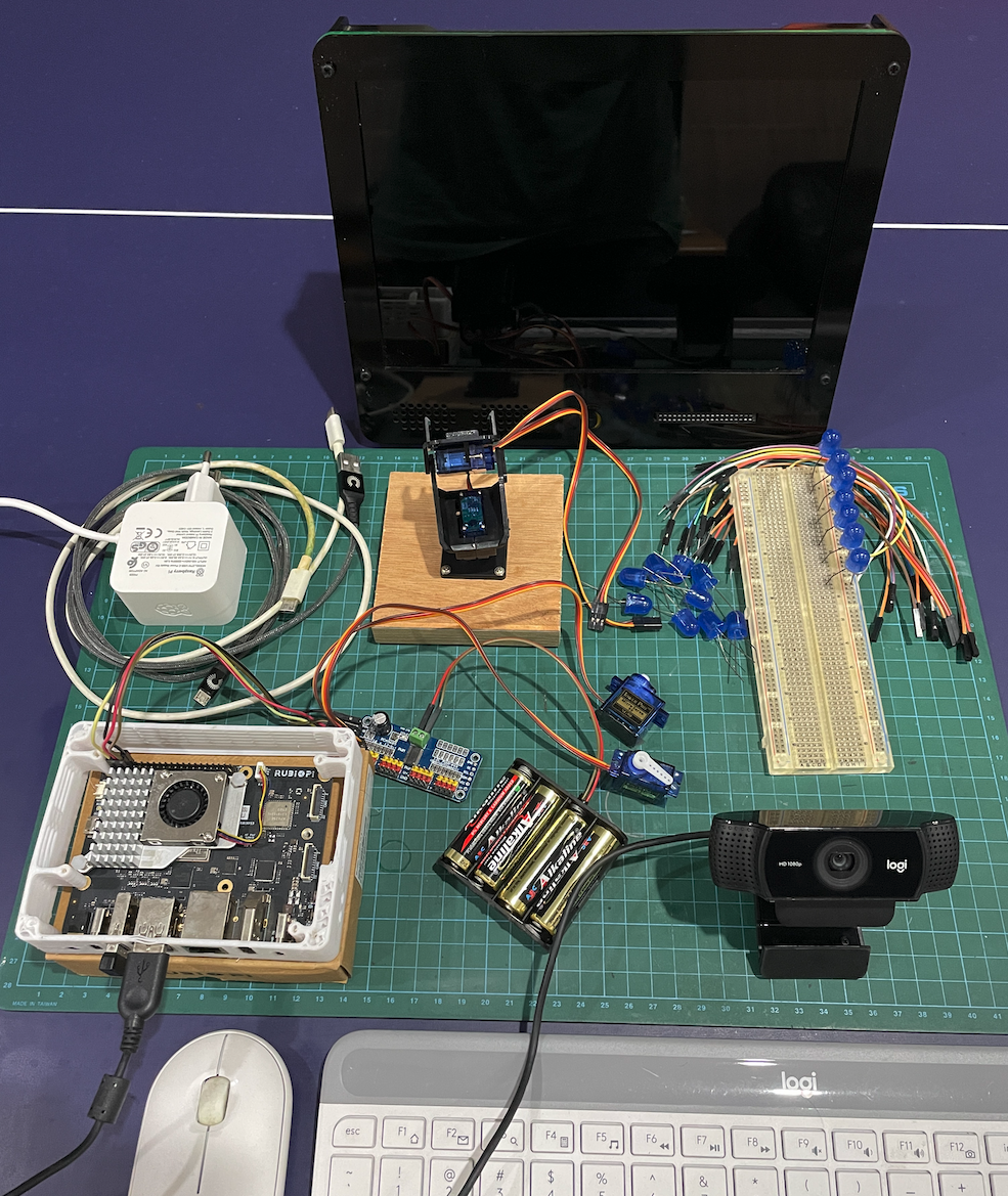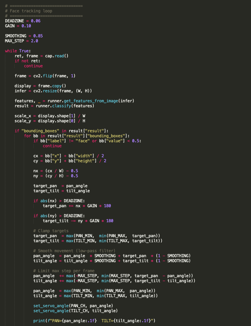 This project is relatively simple, but very useful: it translates the location of an object or a person’s face, into movements of two servos (pan–tilt) that control a camera. In essence, this creates a camera that can automatically follow its target. The system uses an object detection model trained with Edge Impulse, specifically YOLO-Pro to leverage transfer learning and pre-trained weights. This approach significantly reduces the amount of training data required while improving object recognition accuracy. The model is deployed as an embedded .eim model, runn by our Python program. The entire system runs locally on a Thundercomm Rubik Pi 3, which has GPIO compatibility similar to a Raspberry Pi. This allows the use of the PCA9685 via I²C communication to control LED lights or servo motors. The Rubik Pi 3 has proven to be highly reliable, delivering real-time inference performance in our previous projects.
