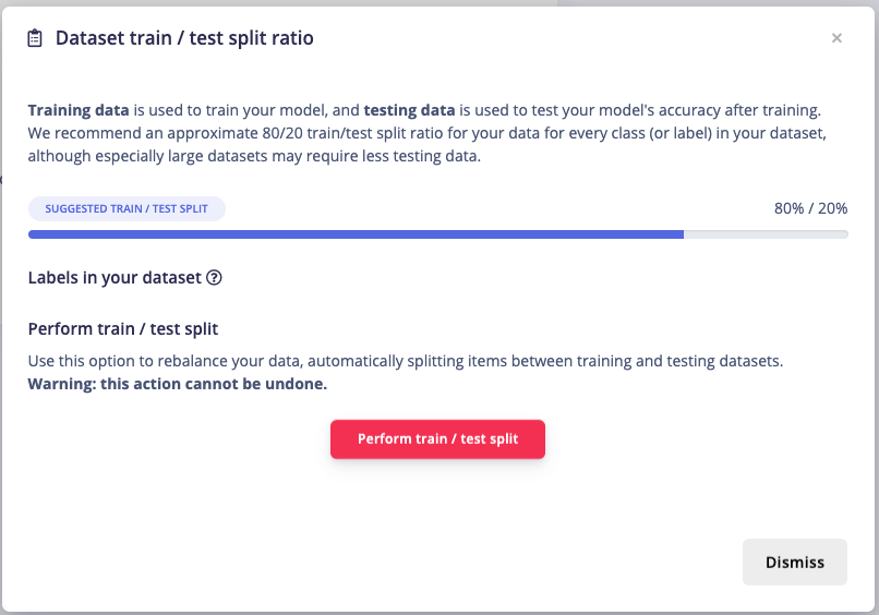 The next step is labeling. Click on Data acquisition, click on the Labeling queue tab, then start by dragging a box around an object to label it. Click Save and repeat the process until all images are labeled. Alternatively, you can try out the AI auto labeling feature to help speed up the process. After labeling, it’s recommended to split the data into Training and Testing sets, around an 80/20 ratio. If you haven’t done this yet, click on Train / Test Split to automatically split the data.