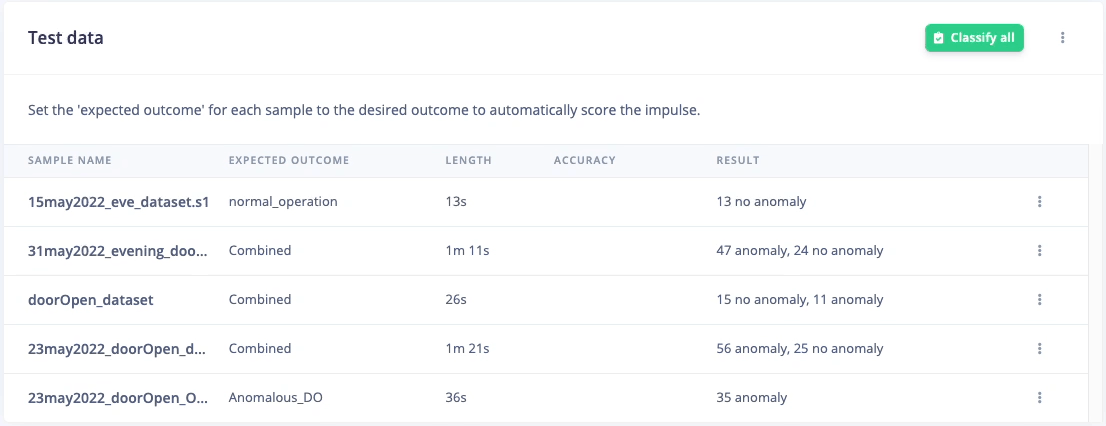 For testing the ML model, Edge Impulse provides two methods: a) Model testing b) Live classification In this project, I have primarily used the model testing method because I already had a lot of data captured. In the data acquisition tab, I assigned some data as test data, which are only used in the model testing.