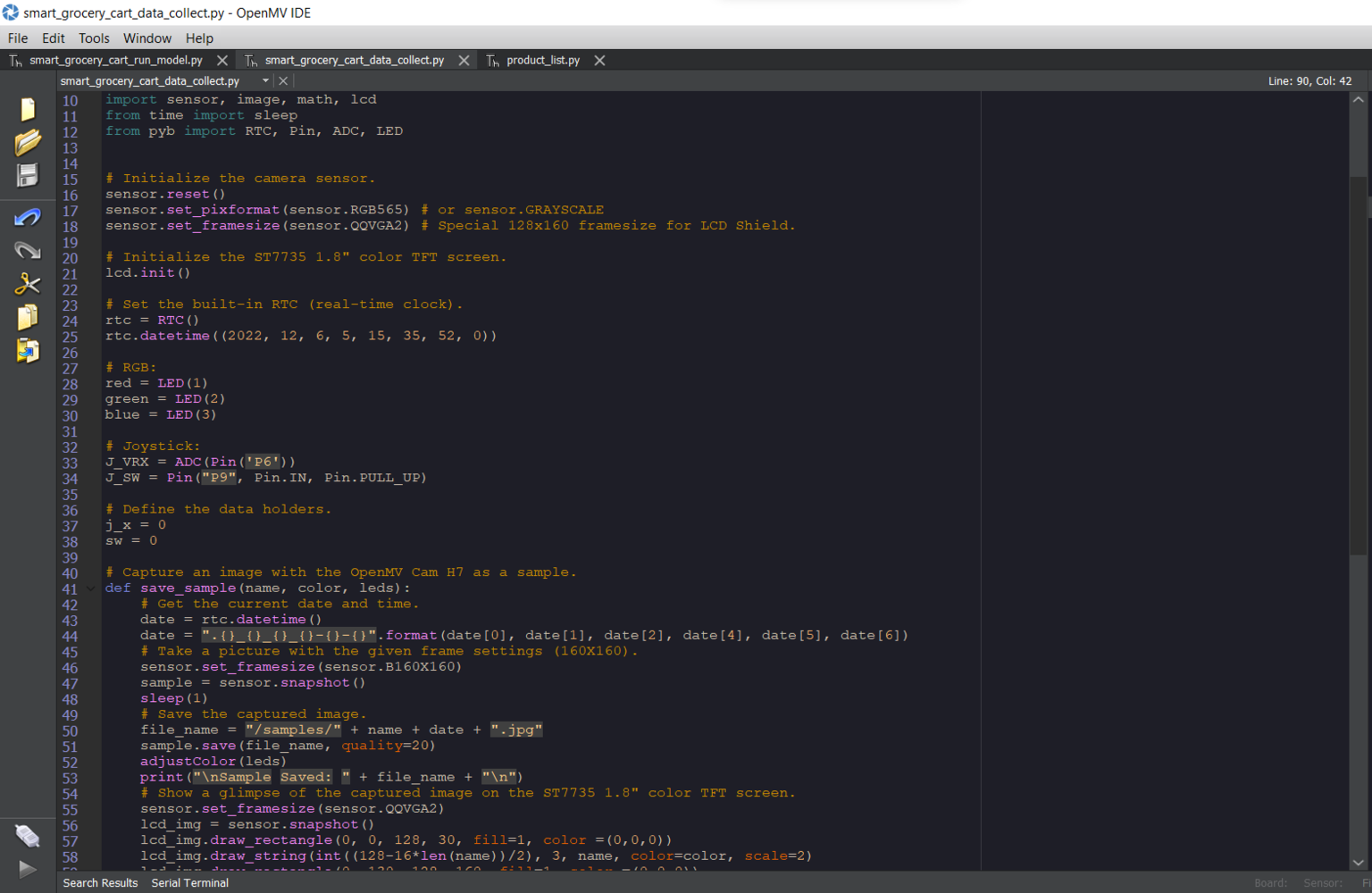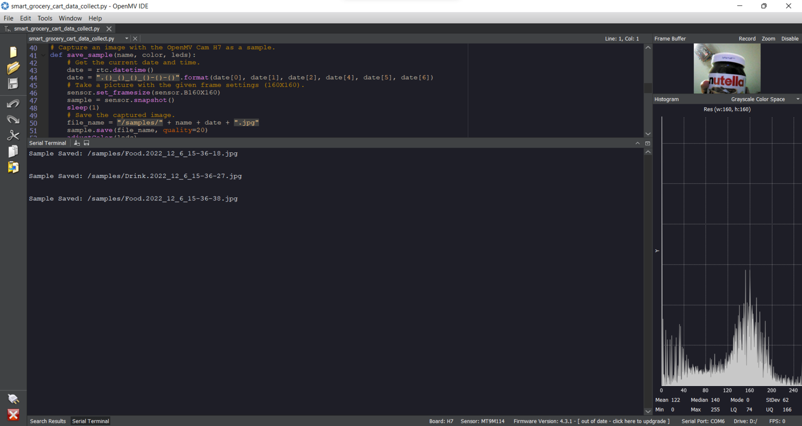 Before proceeding with the following steps, I needed to install the OpenMV IDE in order to program OpenMV Cam H7. Plausibly, the OpenMV IDE includes all required libraries and modules for this project. Therefore, I did not need to download additional modules after installing the OpenMV IDE from here. You can get more information regarding the specific OpenMV MicroPython libraries from here. After setting up OpenMV Cam H7 on the OpenMV IDE, I programmed OpenMV Cam H7 to capture product images in order to store them on the SD card and create appropriately labeled samples for the Edge Impulse object detection (FOMO) model. Since I decided to distinguish foods and drinks with classes while creating a valid data set for the object detection model, I utilized the joystick attached to OpenMV Cam H7 so as to choose among two different classes. After selecting a class, OpenMV Cam H7 captures a picture, appends the selected class name (Food or Drink) with the current date & time to the file name, and then saves the captured image to the SD card under the samples folder.- Joystick (Up) β‘ Food