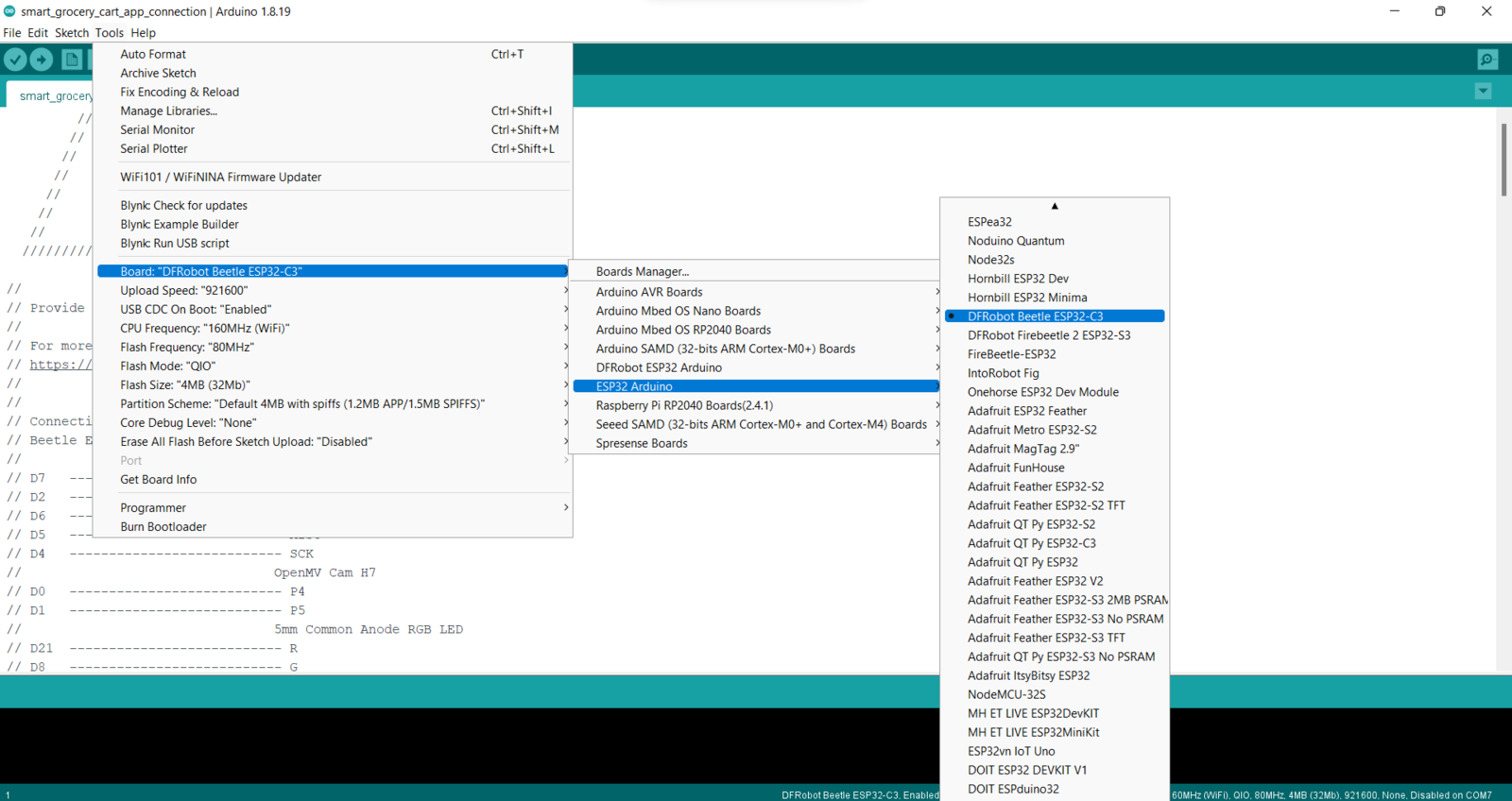 Since OpenMV Cam H7 does not provide Wi-Fi or cellular connectivity, I employed Beetle ESP32-C3 to get commands from OpenMV Cam H7 via serial communication and communicate with the web application via HTTP GET requests. Also, Beetle ESP32-C3 determines when the customer concludes shopping and is ready to leave the store if it detects the assigned RFID key tag UID of the grocery cart via the MFRC522 RFID reader. You can download the smart_grocery_cart_app_connection.ino file to try and inspect the code for obtaining commands from OpenMV Cam H7 via serial communication and communicating with the web application. β Include the required libraries.