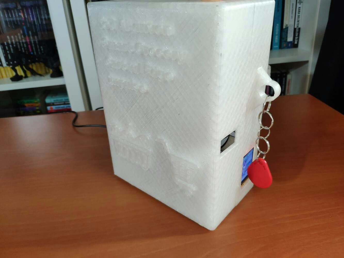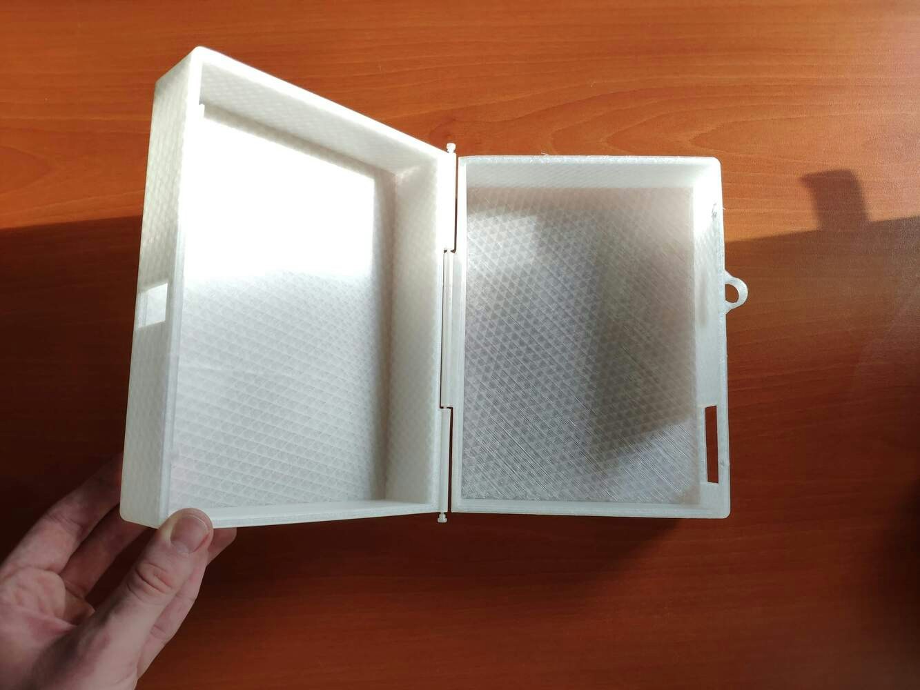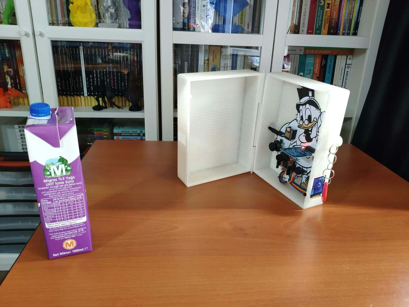 After printing all parts (models), I placed the pin through the hinges on the top and bottom parts and fixed the pin via the pin ends (caps). I affixed the Scrooge McDuck PCB to the bottom part of the hinged case via a hot glue gun. Then, I attached the ST7735 TFT display to the hinged case via its slot on the bottom part to make customers see the screen even if the hinged case is closed via its built-in snap-fit joints.
