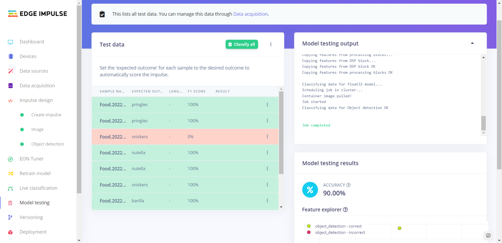 After building and training my object detection model, I tested its accuracy and validity by utilizing testing image samples. The evaluated accuracy of the model is 90%. :hash: To validate the trained model, go to the Model testing page and click Classify all.