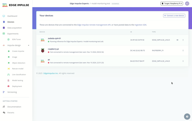 Managing large fleets of Edge Devices can get complex. The ZEDEDA Cloud solves this by offering a centralized platform that makes managing Edge Devices and Apps easy. The ZEDEDA platform however does not have insights on what our Edge Apps are actually doing. With Edge ML applications it is particularly important to get insights about our model’s performance in the real world. Up until recently, in Edge Impulse implementing monitoring of production Edge ML apps was left to the users. Now, Edge Impulse is working on a new set of Model Monitoring features, meant to enable deployment and monitoring of EdgeML apps. With Model Monitoring enabled on our ZEDEDA Edge App we can benefit from the following features:- New devices running the Edge App are automatically populated in the Devices tab in EI Studio.