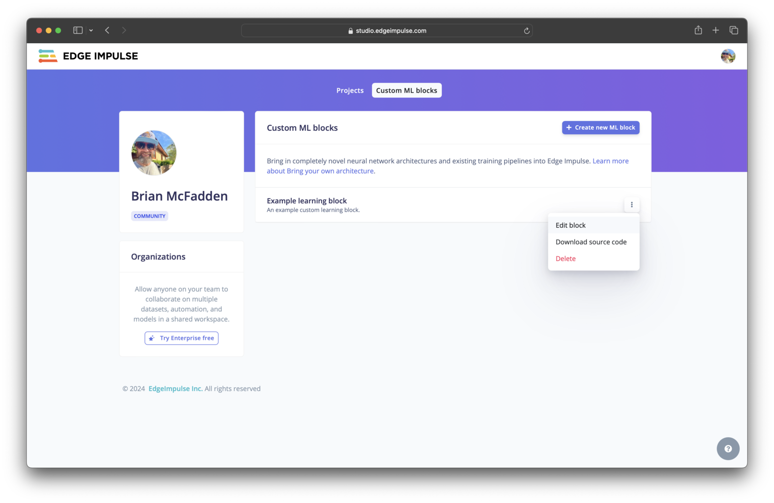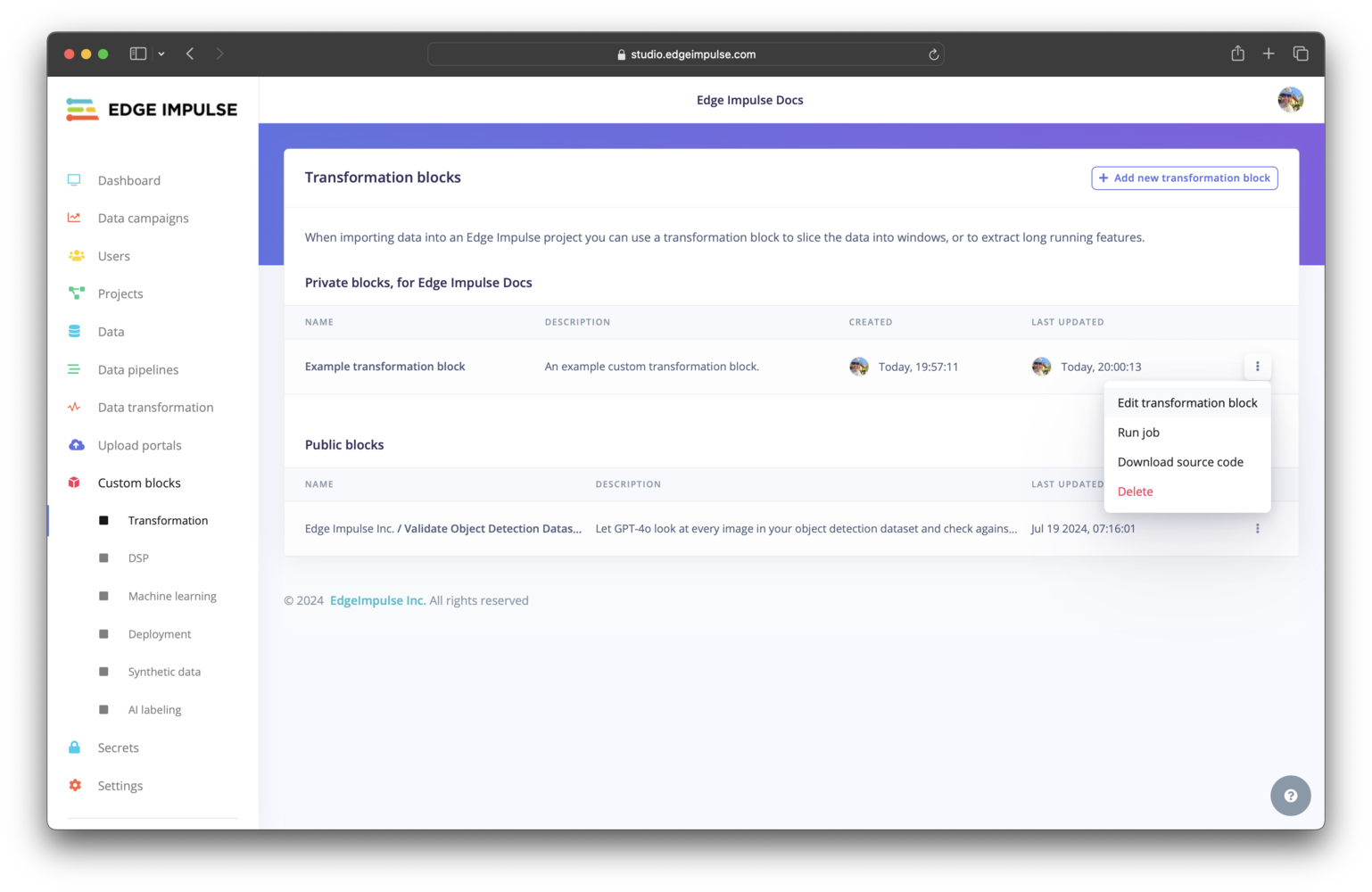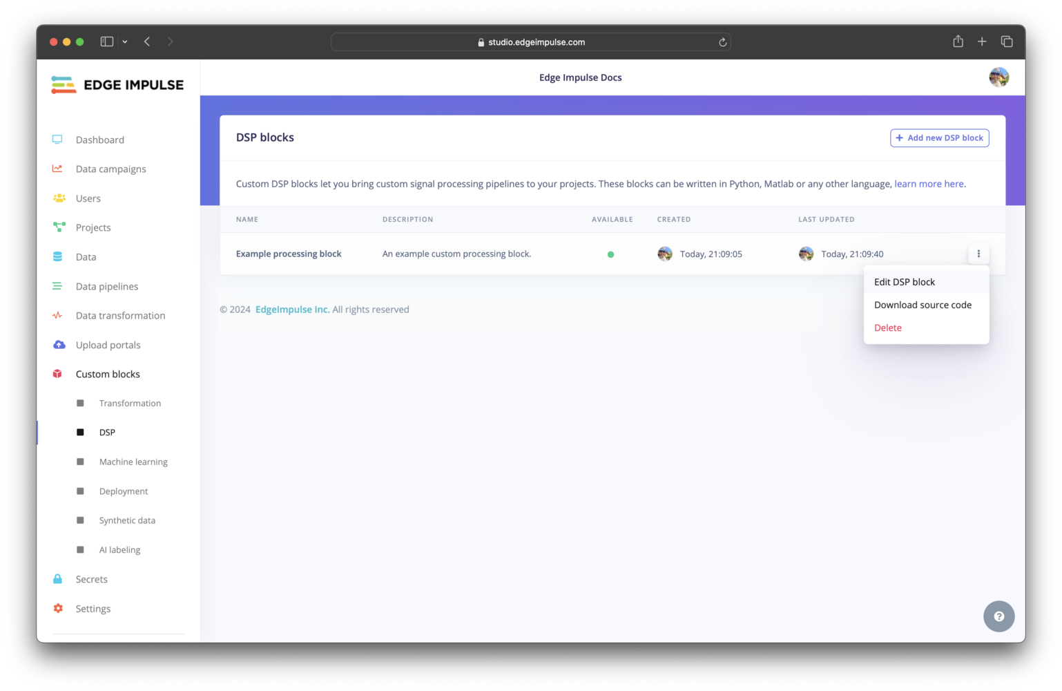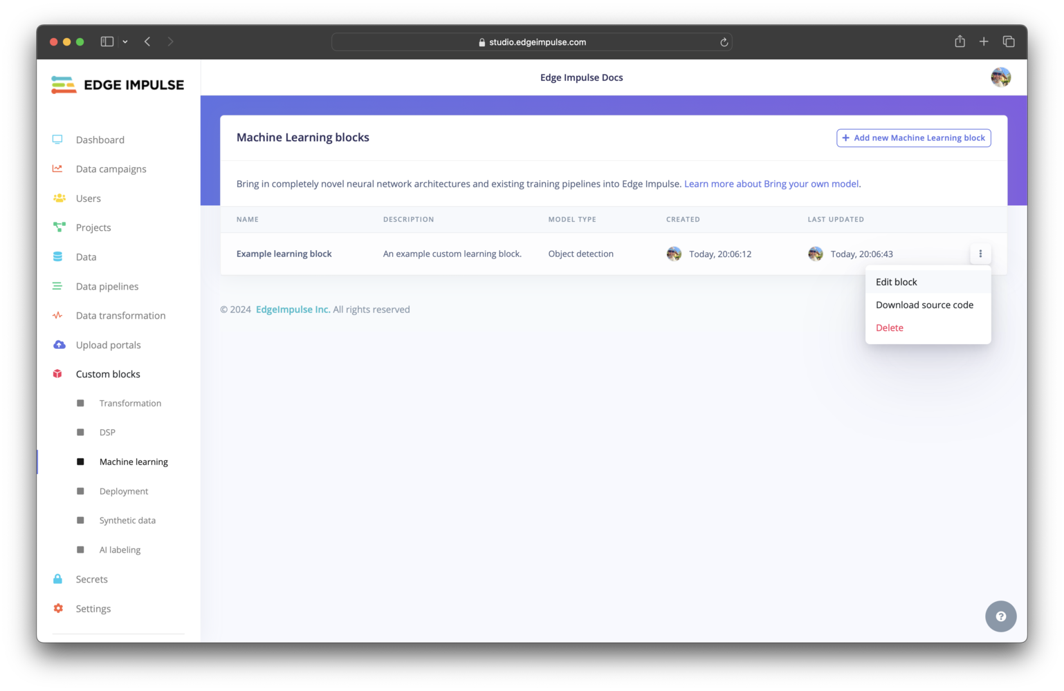 After successfully pushing your custom block to Edge Impulse you can edit it from within Studio.- AI labeling